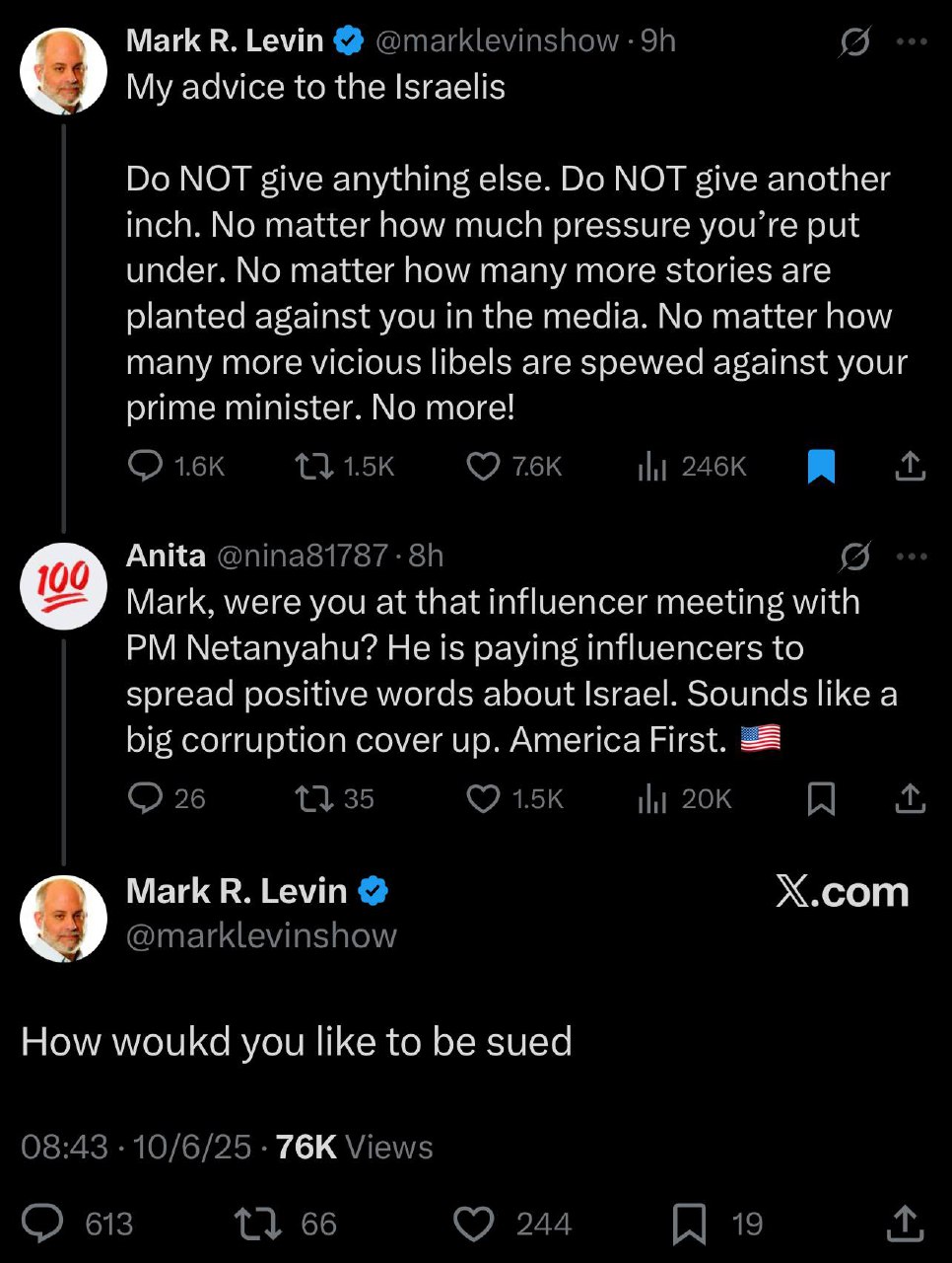 Mark Levin is threatening to sue people on twitter accusing him of being a paid Israel shill.