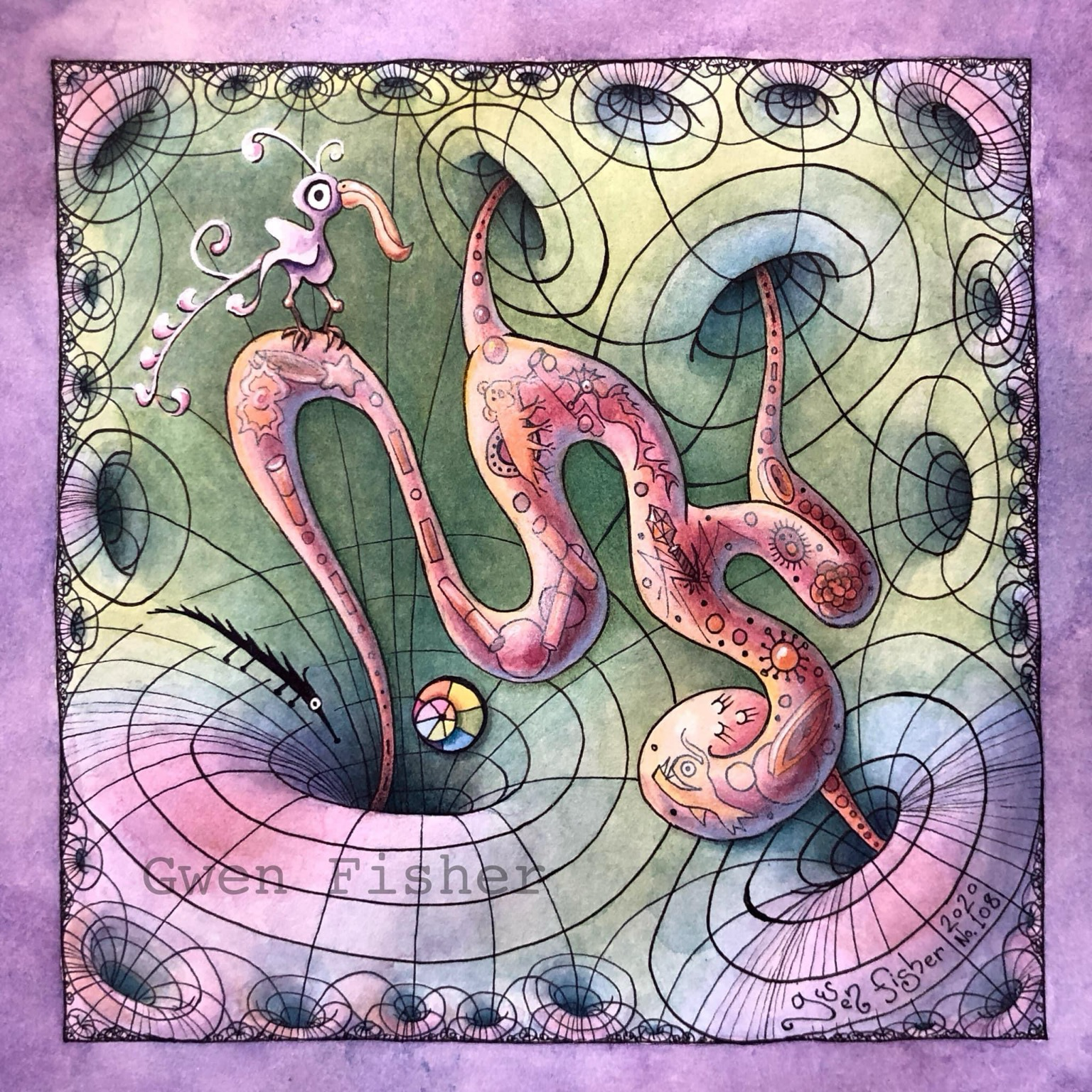 Drawn with archival archival black pigment ink, highly lightfast (fade resistant) watercolor pencils, mica paint on Arches 300 GSM 100% cotton paper