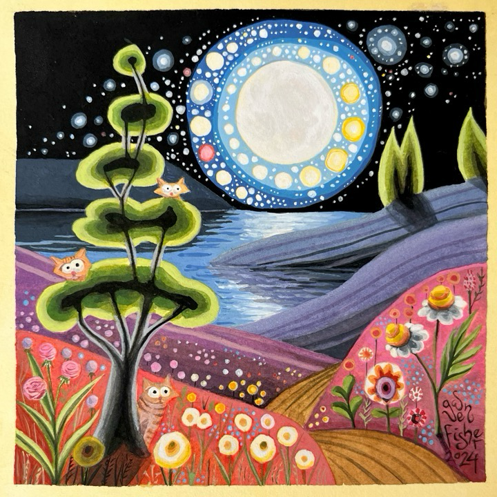 For the record, some gouache painters say that your gouache paint should be thick like heavy cream and not watered down. They say your brush strokes should be well defined and minimal. While those might be good advice more generally, I broke broke both of those rules a thousand times on this piece. I work in many layer, thin to thick, and I pet my painting with my brush. Paint in the way that feels natural to you, and your style will emerge naturally.