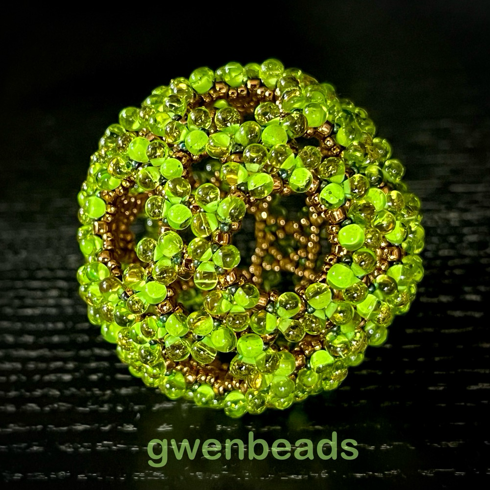 It measures 1.25 inches across. It contains 624 beads and a few meters of fishing line to hold them all together. After all of these years of weaving beads, I still find it remarkable that we can make hollow structures with them that have such large holes.