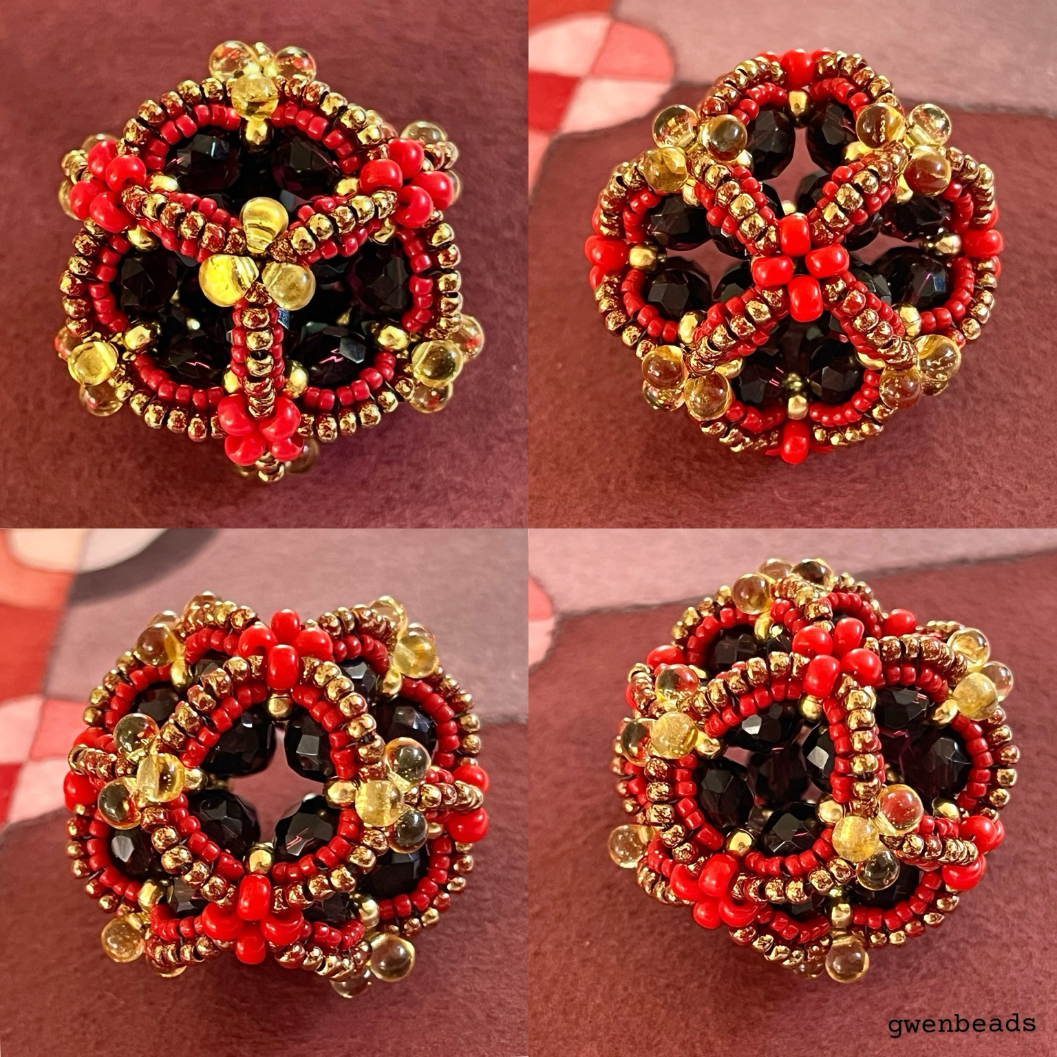 It contains 1620 beads and several meters of thread. It measures about 5 cm in diameter and is probably the most hollow beaded bead I’ve ever stitched.