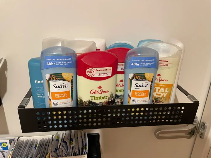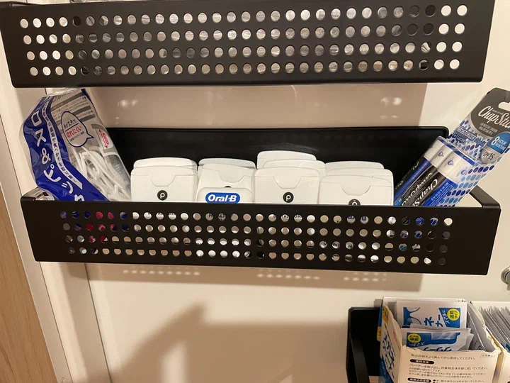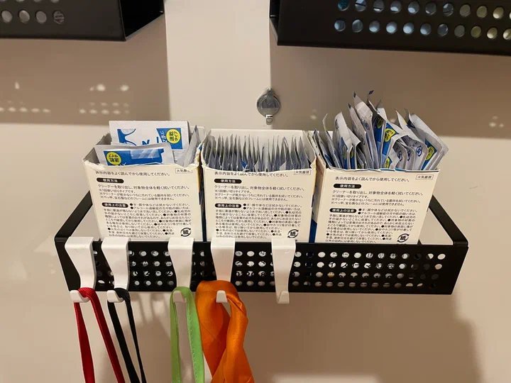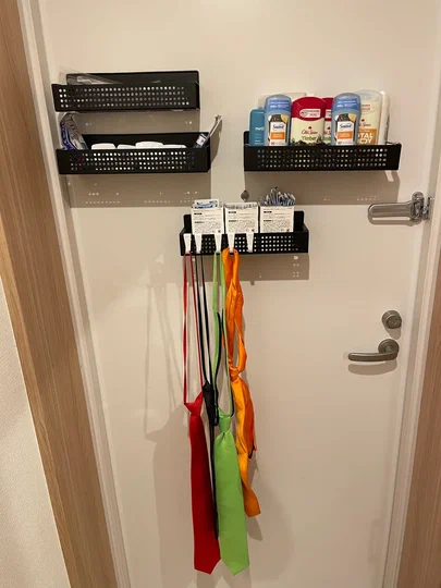 I used magnetic spice rack shelves on my front door to create even more storage space. The reason the neckties are hanging there is to make it harder to go out the front door without putting one on. -