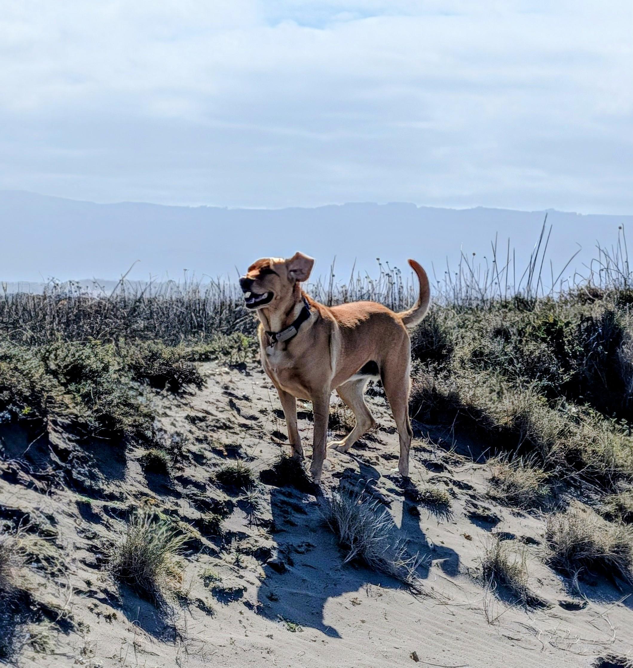 The wind was almost too much for me. It was sand in the eyes level fierce. The shifting sands also make for more precarious walking and I did fall down once. I tripped on a root that the wind uncovered. It took Summer about 15 seconds to realize I was down. She raced to help and stood uphill where I could use her collar to steady myself to stand up in the soft drift.