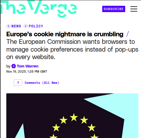 finally!! the internet became worse since this poorly thought-of non-sense started. https://www.theverge.com/news/823788/europe-cookie-prompt-browser-changes-proposal
