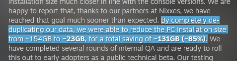 Helldivers 2 devs have reduced the install size from ~154GB to ~23GB. That is a MASSIVE gain! Kudos on taking the time to cleaning up this tech debt, which I guess was mostly "assets debt" xD https://store.steampowered.com/news/app/553850/view/491583942944621371?l=english