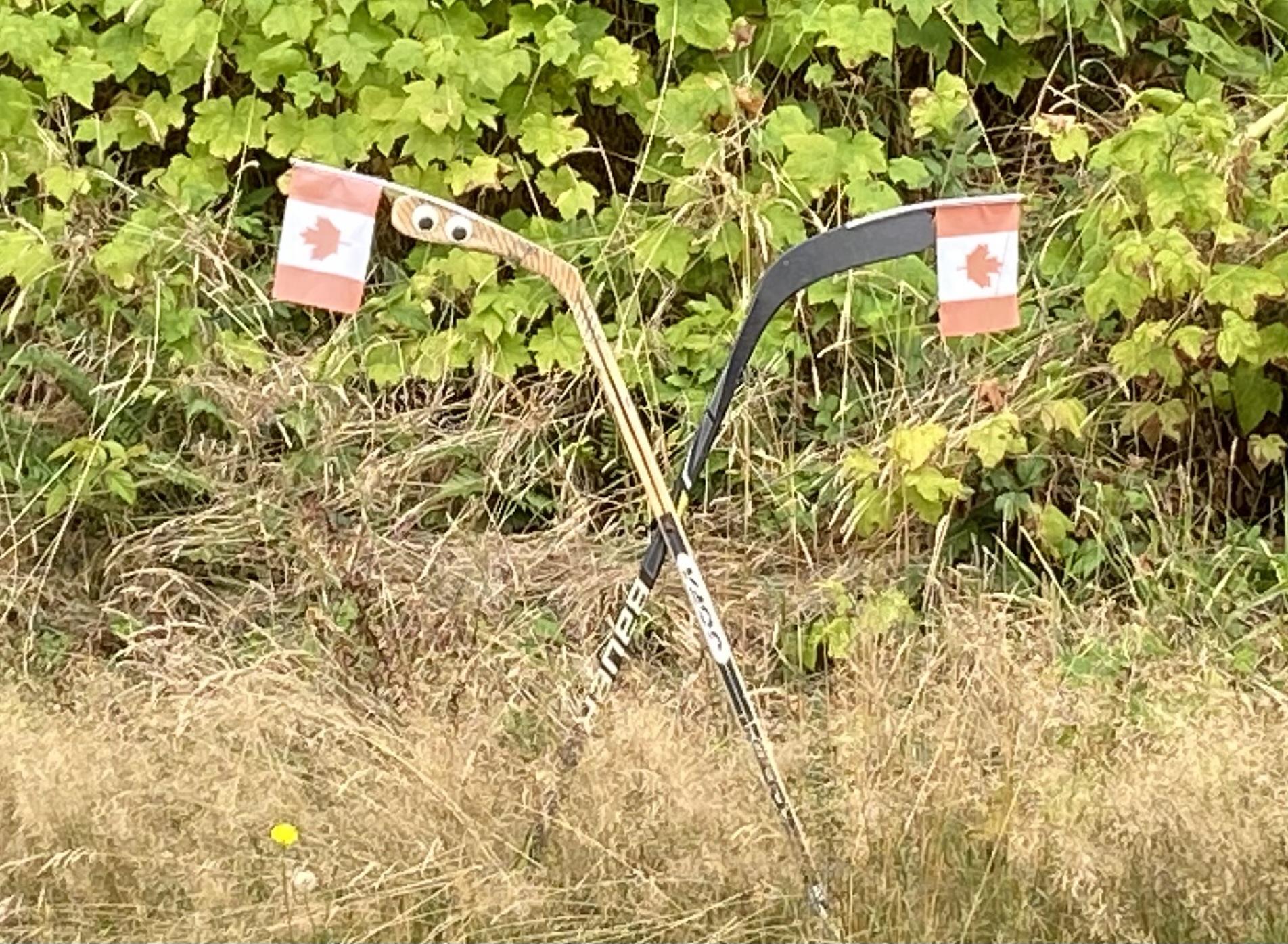 the sheepdog training place is just off 1 Ave, which is the Canada-US border. Seen in passing: a US cop in full fatigues, Kevlar vest reading “POLICE,” searching a ditch on the US side. A giant US flag on a pole at the T-junction onto 1 Avenue, on the US side, at the fenceline of a private house, centred. And this little display a mile or so along the Canadian roadside, citing Mike Myers’s “elbows up” reference to stroppy hockey great Gordie Howe on SNL back in March. #canpoli
