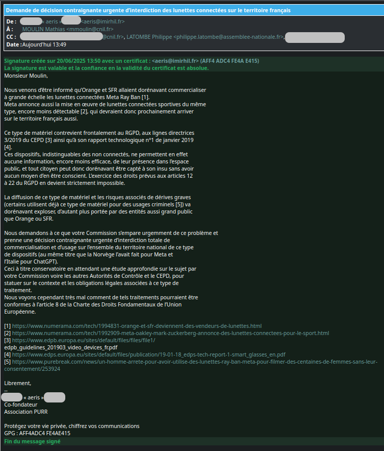 Nous venons de demander à la CNIL l’émission d’une décision contraignante urgente afin d’interdire sur le territoire national la vente et l’usage de lunettes connectées Meta Ray Ban