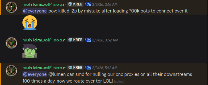 For the past week, the massive “Internet of Things” (IoT) botnet known as Kimwolf has been disrupting The Invisible Internet Project (I2P), a decentralized, encrypted communications network designed to anonymize and secure online communications. I2P users started reporting disruptions in the network around the same time the Kimwolf botmasters began relying on it to evade takedown attempts against the botnet’s control servers.