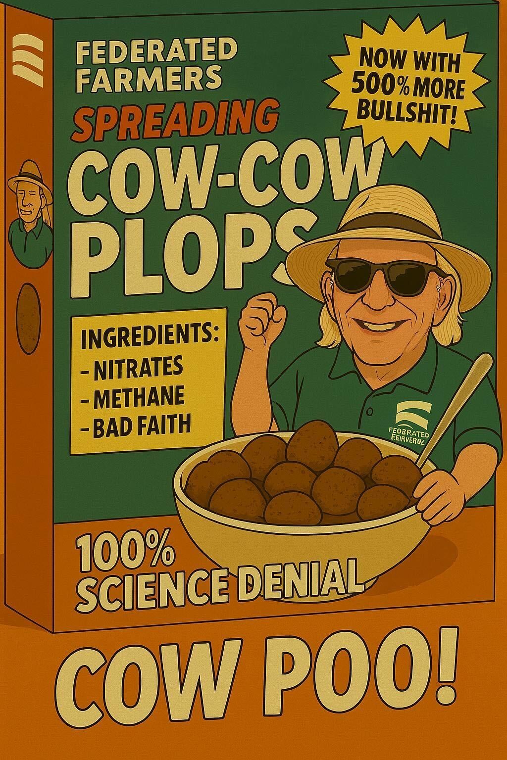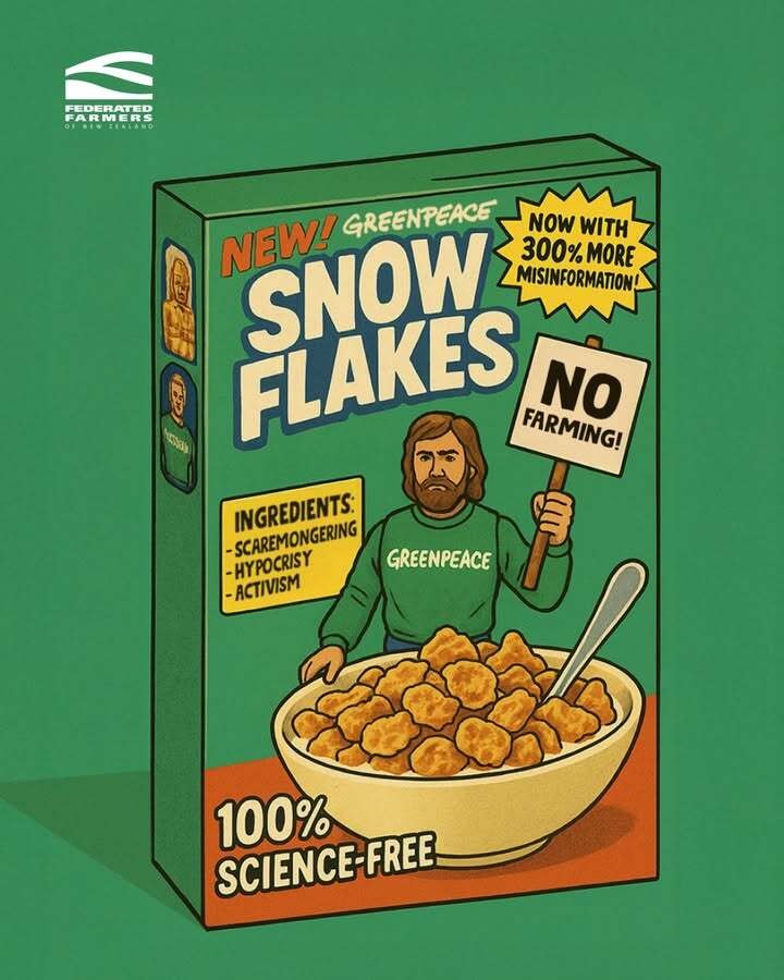 Federated Farmers are having a go at Greenpeace and we all think it's very cute, but they really should pay a designer, instead of using AI, because JOBS! but also bc then they can avoid weird stuff like C3P0 somehow hanging out on the side of the box. 😂