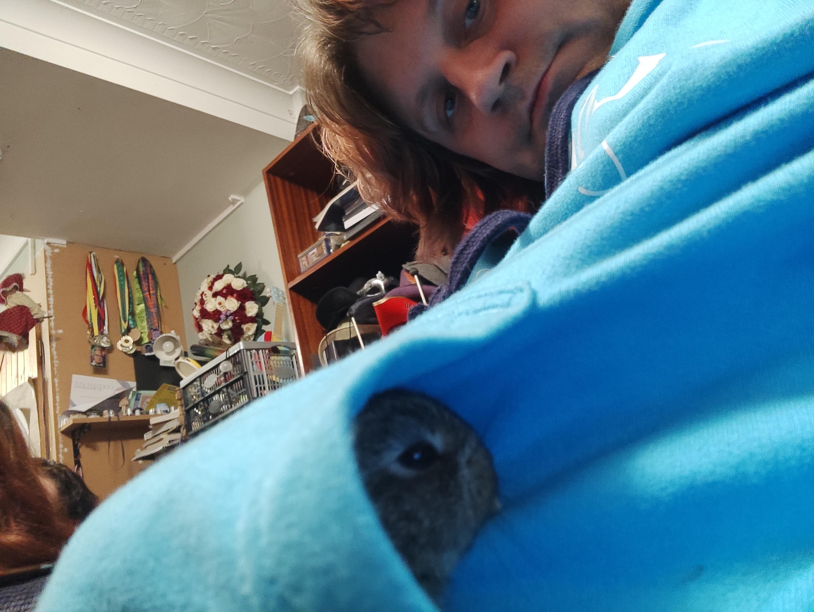 They've reached the age we're supposed to start interacting with them and getting them used to human handling. Seems they like curling up in my pockets! As they're routinely leaving the nest now, we think it's safe to move them to more appropriate accommodation (the current setup is just what we'd cobbled together at short notice to rescue their mum...), so a proper hutch is on order to be delivered tomorrow.