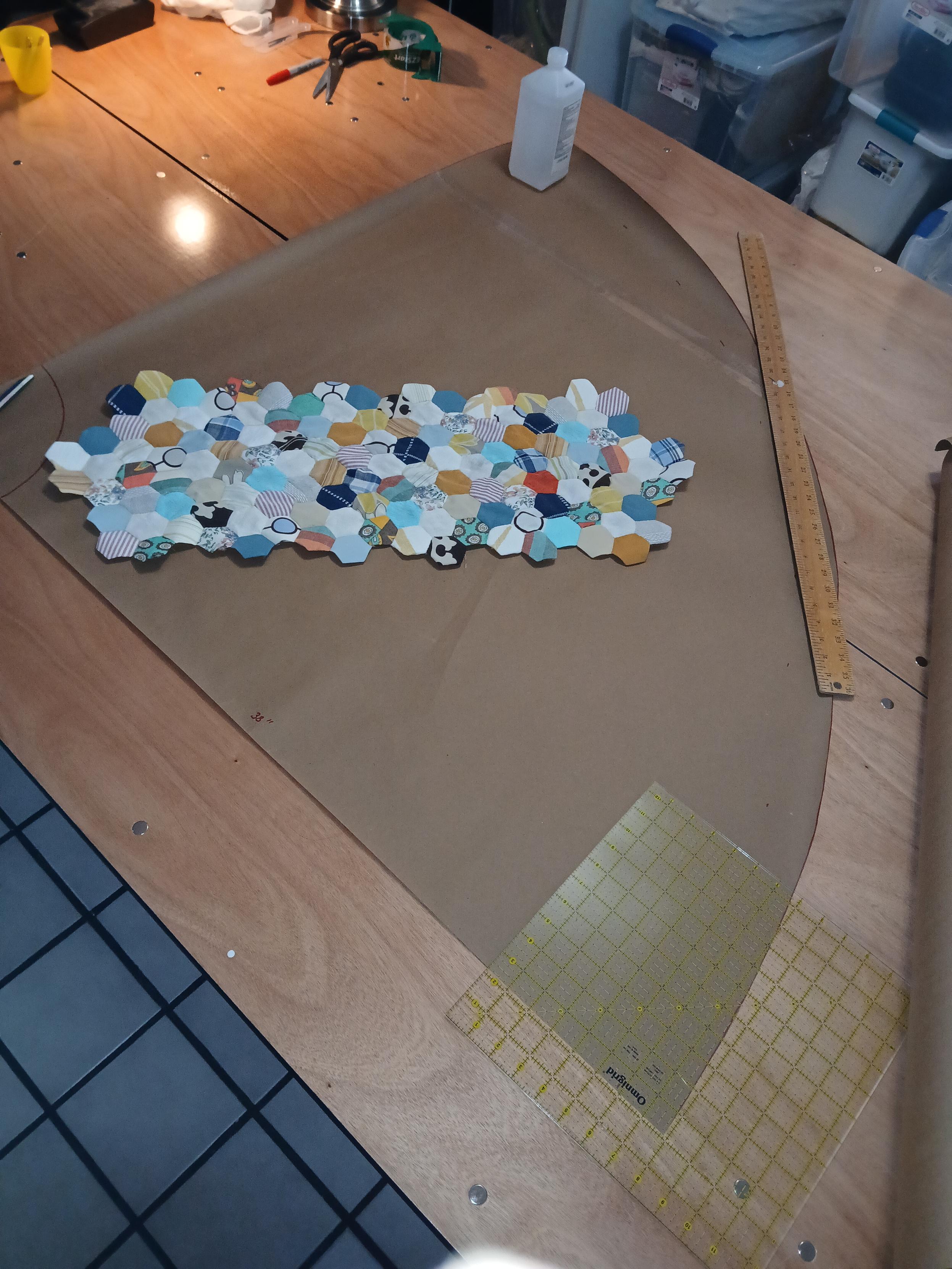 Here is what I have made so far on the hexagon quilt top skirt on top of the circle skirt pattern I just drafted. For a full circle skirt, I make 4 of these. It's gonna take a minute. :)