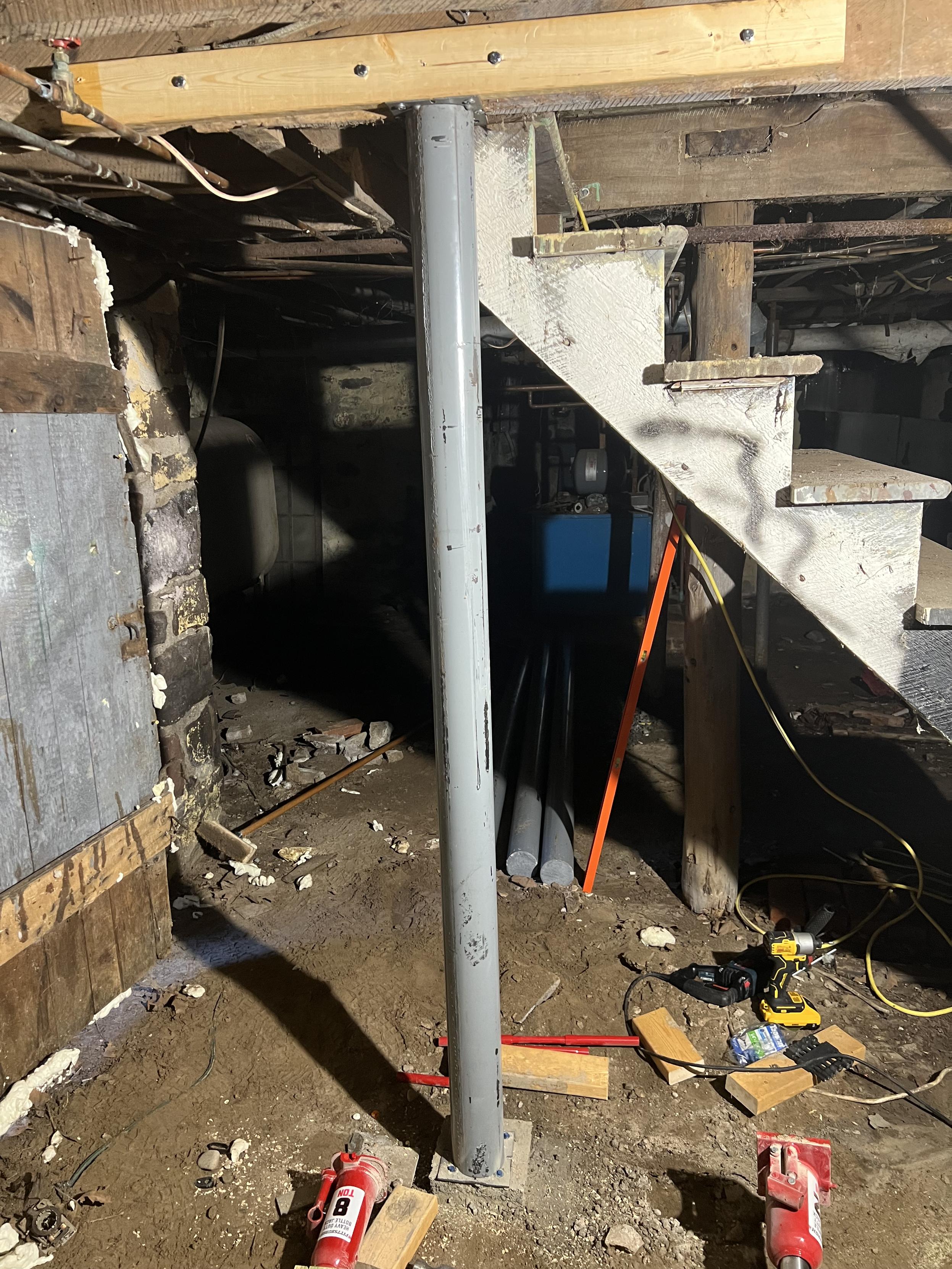 Fist Lally Column is in place! The joist it supports now does not budge. AT ALL.