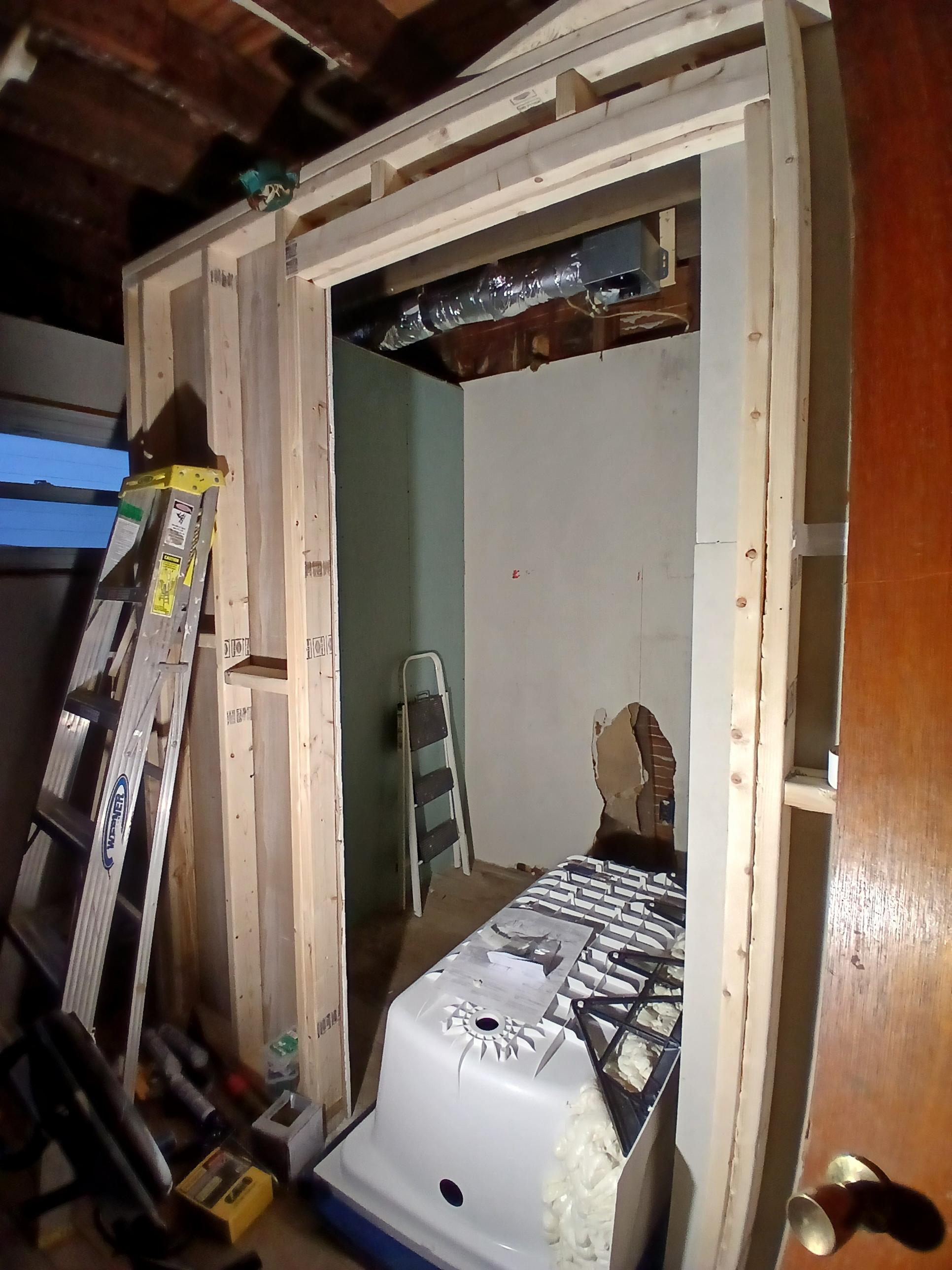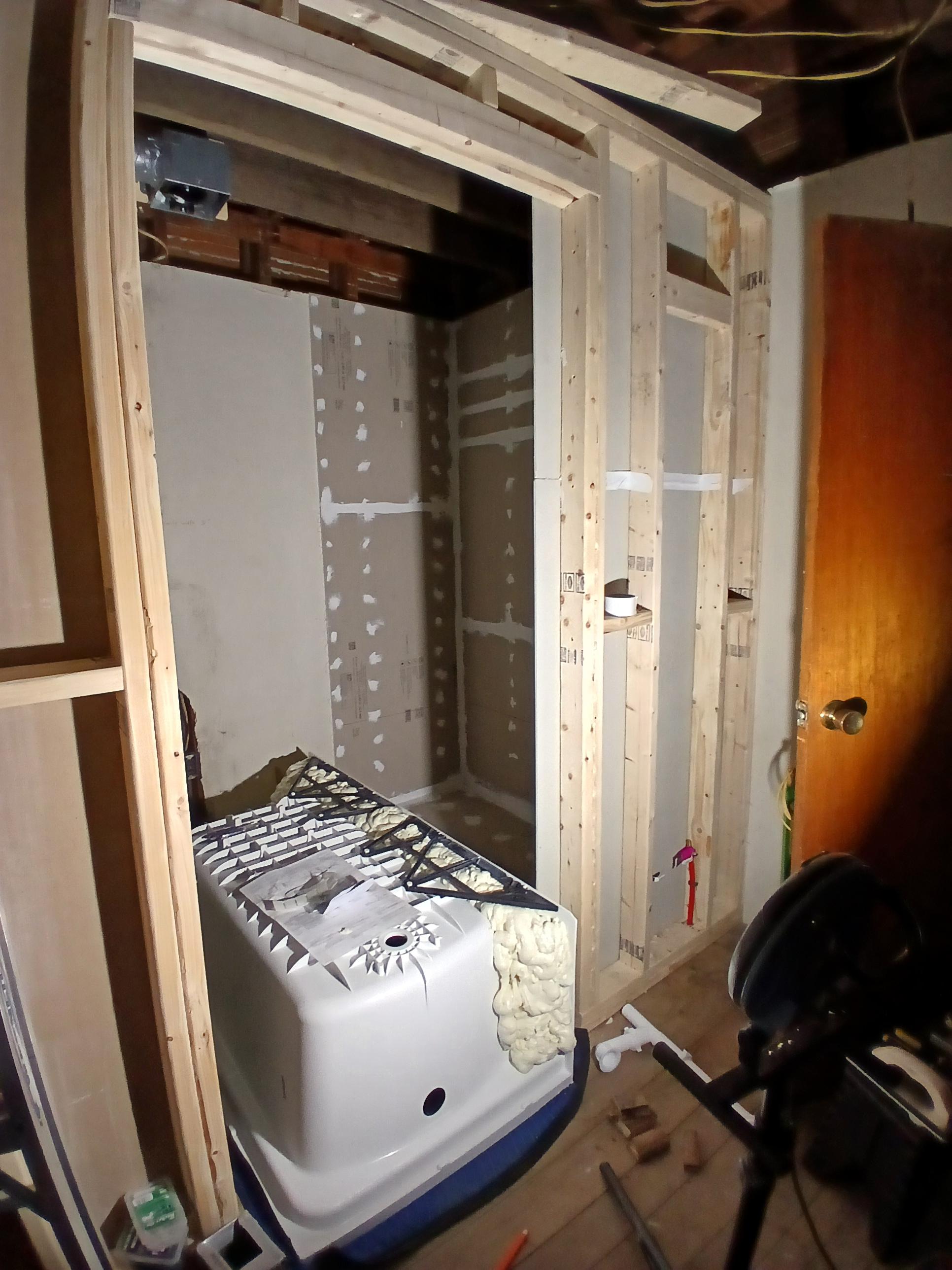 Here's where we have gotten so far today. Greenboard is up, the floor joist is being worked on right now. The expanding foam is about done doing its thing. Once the work in the basement is done, The tub goes in, then I start putting down hardieboard on the floor to accept the tile. I am using mastic and poly blend grout to set the tile. Thinset would just crack and be a big ol mess.