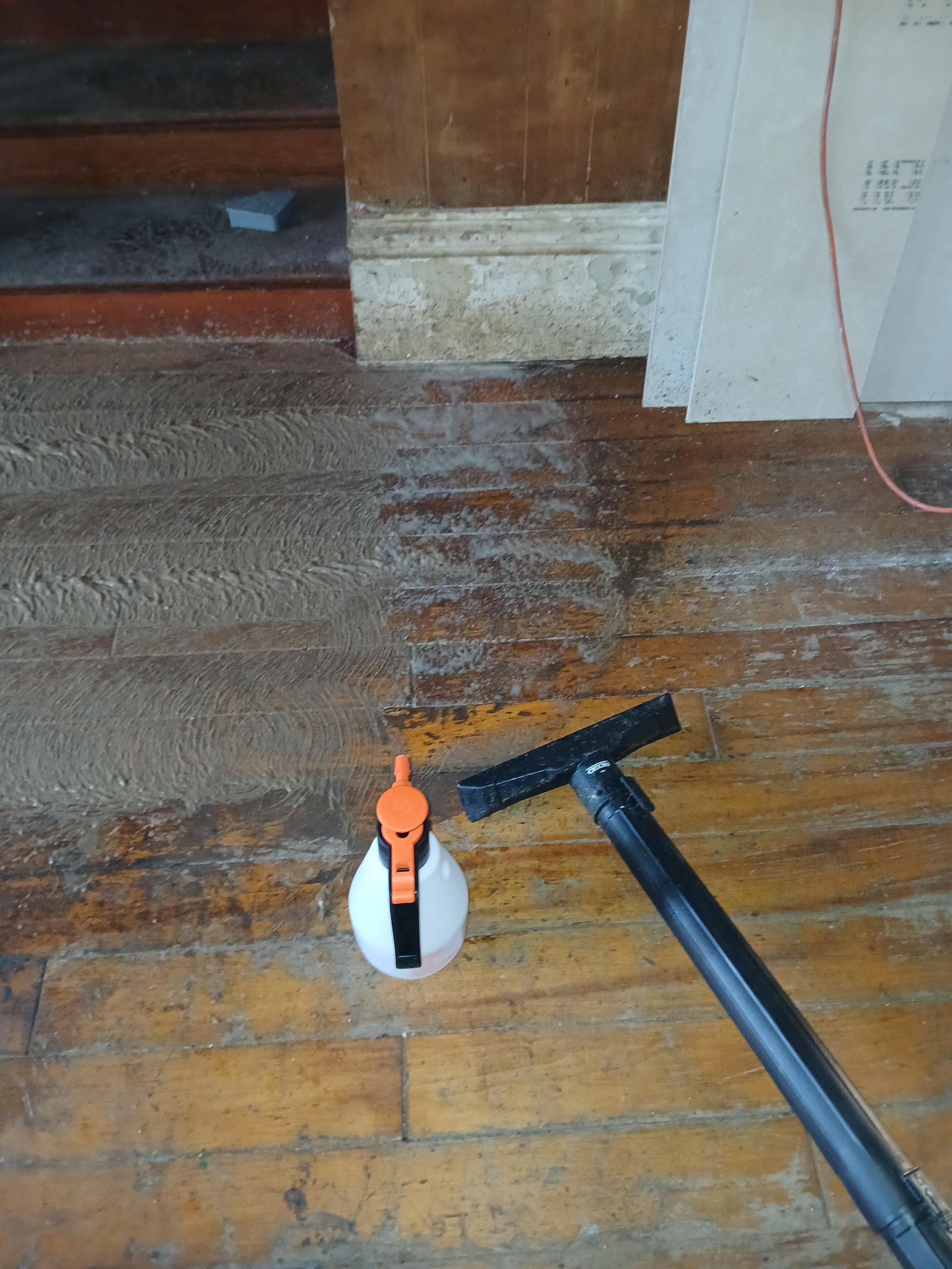 Here's the process. Put cleaner down full strength and scrub with the orbiter about 4 times back and forth. Spray down the suds with water from a garden sprayer, then suck up the muck into the shop vac.