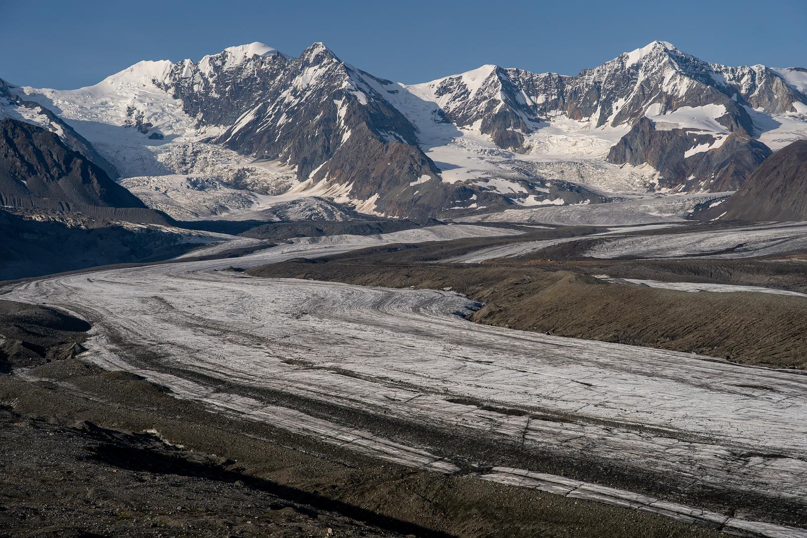 From the western marginal moraine, the glacier’s movement is visible in looping moraines, while active icefalls continue to feed the upper basin.