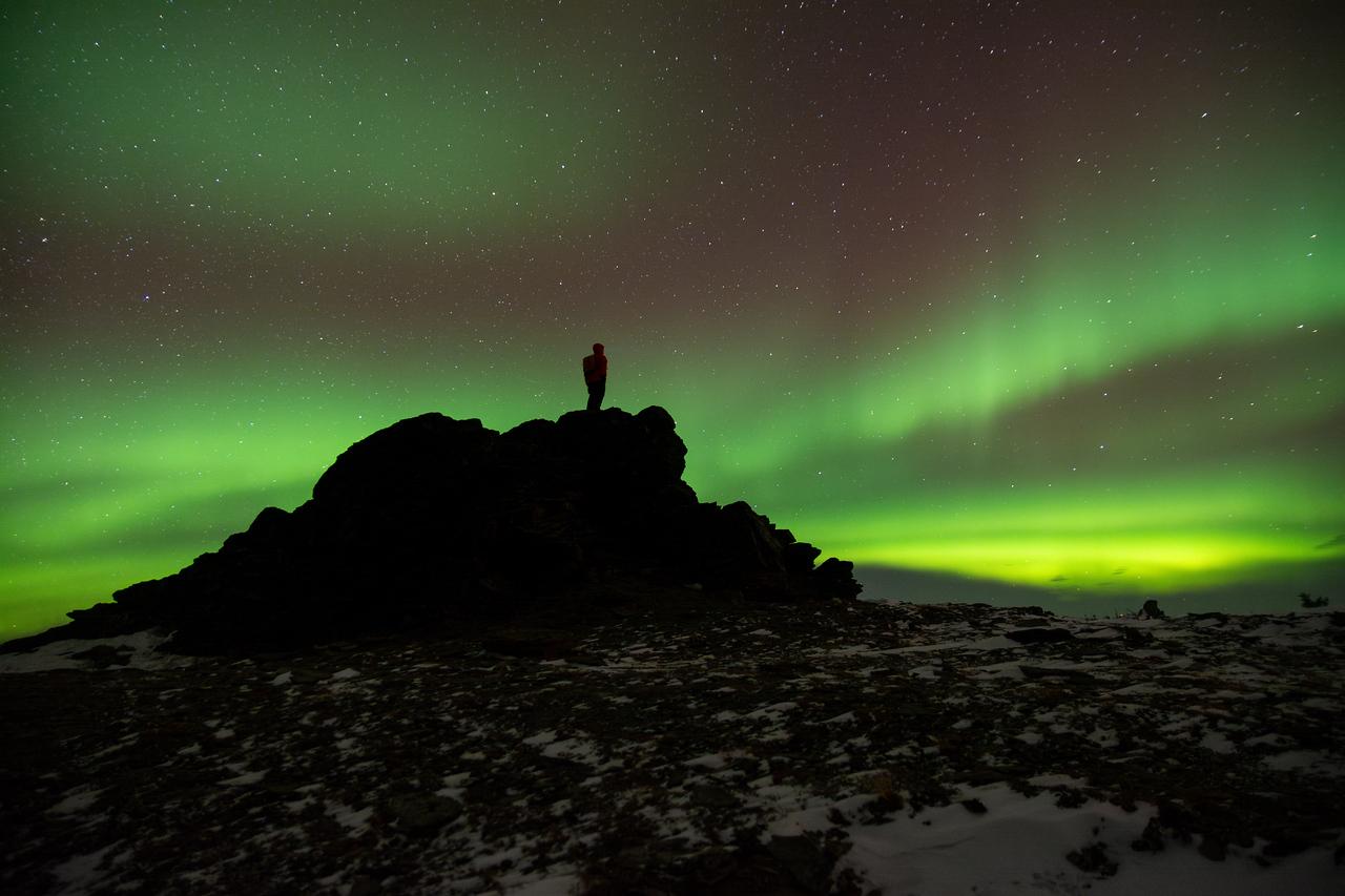 Aurora borealis lighting up the sky above the Angel Rocks Trail on a windy night.