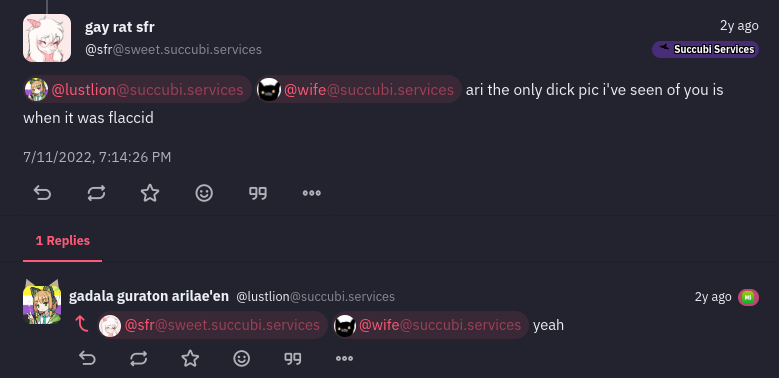 me and Ari met on fedi on the summer of 2021, when i was 16, and it almost 21. it was my first real relationship, so i didn't know what to expect, and what red flags to look for. almost immediately we started sharing nudes and engaging in erotic roleplay. i unfortunately don't have any backups of the XMPP messages we exchanged back then, but i will point you to the now-defunct lewd accounts sfr@rats-at.work and sfr@sweet.succubi.services, which may be viewed if your instance is old enough to have cached it before the server went down years ago. no nudes were posted on that account, at least not publicly, for legal reasons, but i was very outwardly sexual towards anyone who would reciprocate it, no matter the age gap.