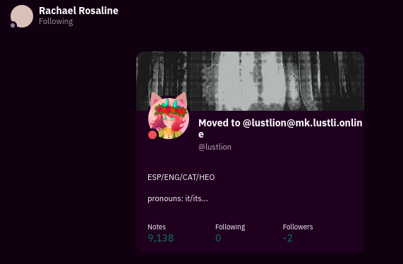 ooh, right, let's talk about Eve! Ari has continued to be friends with Eve (later Rachael) long after shit hit the fan, occasionally telling me it had talked with her over Discord. when Eve came back to fedi on rosaline.systems, that instance was allowlisted, and one of the only instances allowed: misskey.heonian.org. Eve followed Ari and boosted a few of its posts, which would not have been possible had Ari blocked Eve.
