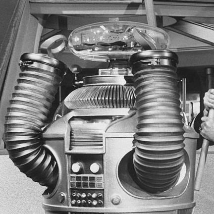 @p [Millennial Annotation Channel: This is the Lost in Space Robot, known on the show simply as 'Robot.' When danger reared its ugly head the Robot would exclaim, 'Danger, Will Robinson, warning! Danger, danger, danger!' while flailing his dryer hose arms like an infantile retard.] -