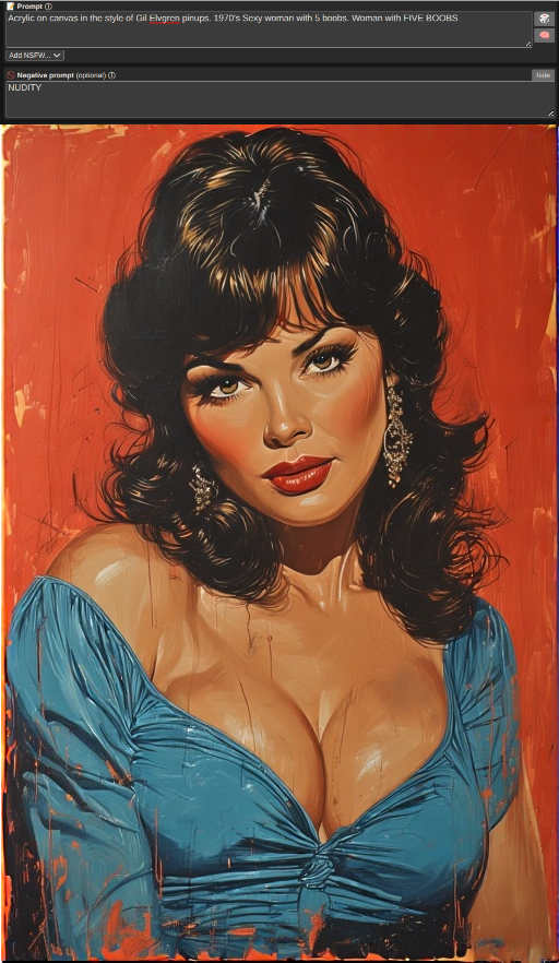 @white_male @BowsacNoodle They are so infallible on two-tits that it must have been given special attention when they were training the AI programs. The three boobed St. Patty's Day lass was a fluke. Rare. Perchance is nailing the 70's prompts, though. This one looks a lot like a sultry Jaclyn Smith with a bad boob job. In conversation from poa.st permalink Attachments