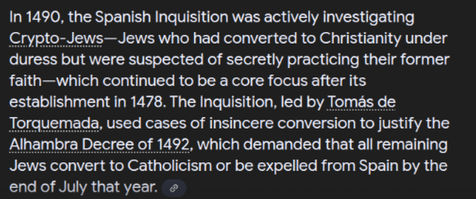 @ontheway @Zardoz So, the whole 'age of expiration' where certain people left their homelands to sail into danger for the chance of treasure had some interesting inputs.. As the inquisition and following suppression and conversion of jews hiding within their civilization, Columbus, and the following conquistador missions were largely stocked by those very crypto-jews the inquisition was hunting, much of the forced interbreeding of the tiano people was kosher as the resulting Latino genes show today, and we see it in the behavior.. invasion, subversion, occupation, perhaps Sheinbaum is more Mexican than we give her credit for..