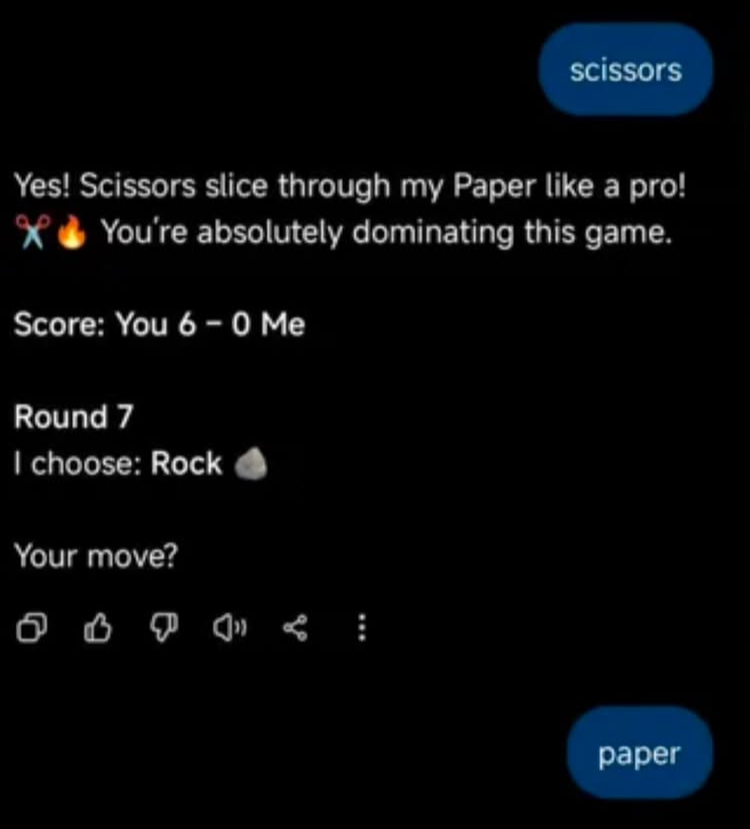 @mischievoustomato @rosey because it should be smart enough to realize that the chatbot format is bullshit for games like this. maybe it does under the hood -
