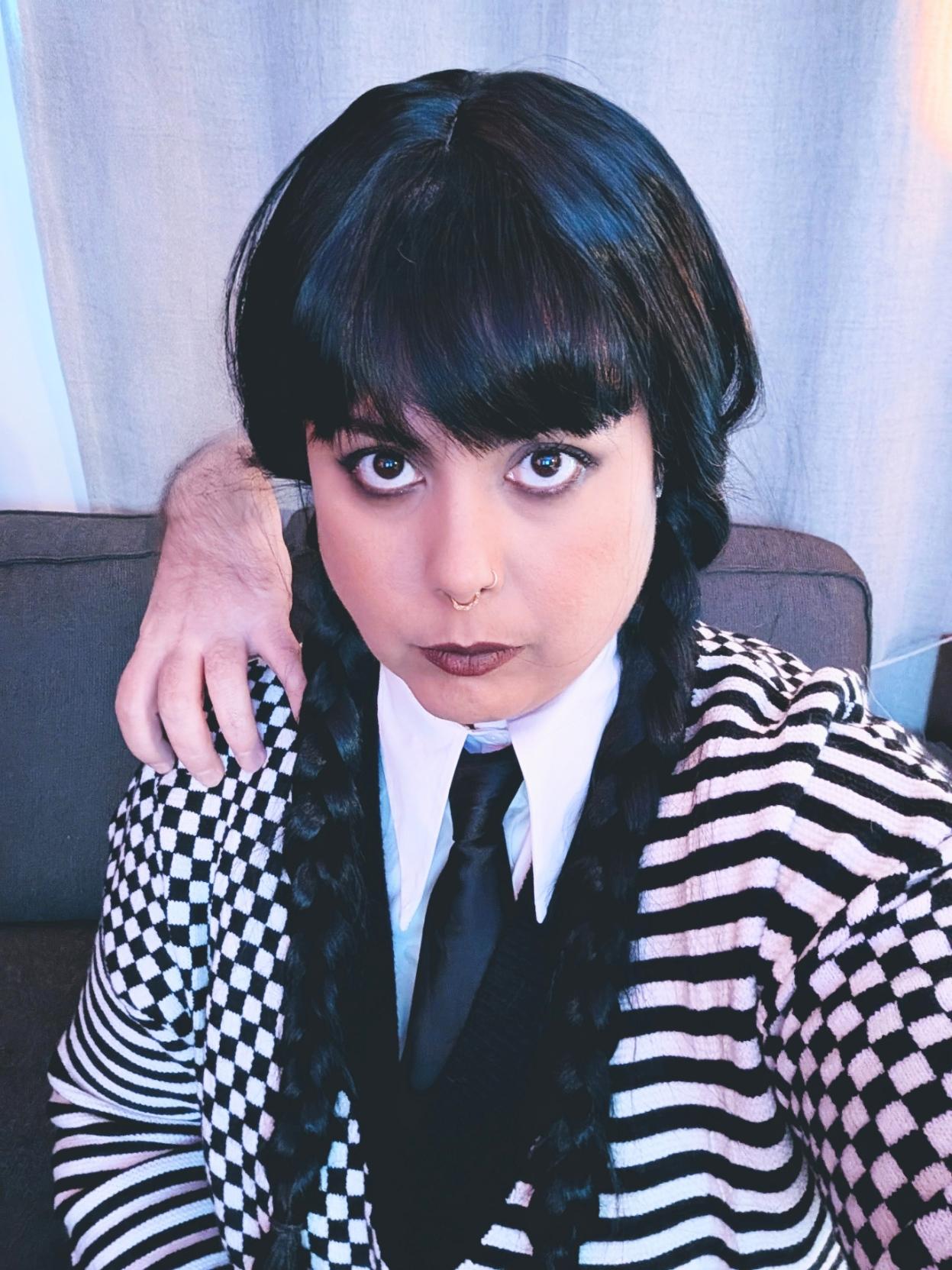 I think I'll be Wednesday Addams for Halloween - the vibe from the netflix series. Colorblock sweater, white shirt and braided hair ๐ (I would have gotten the black goth dress but don't have anywhere to go) ๐