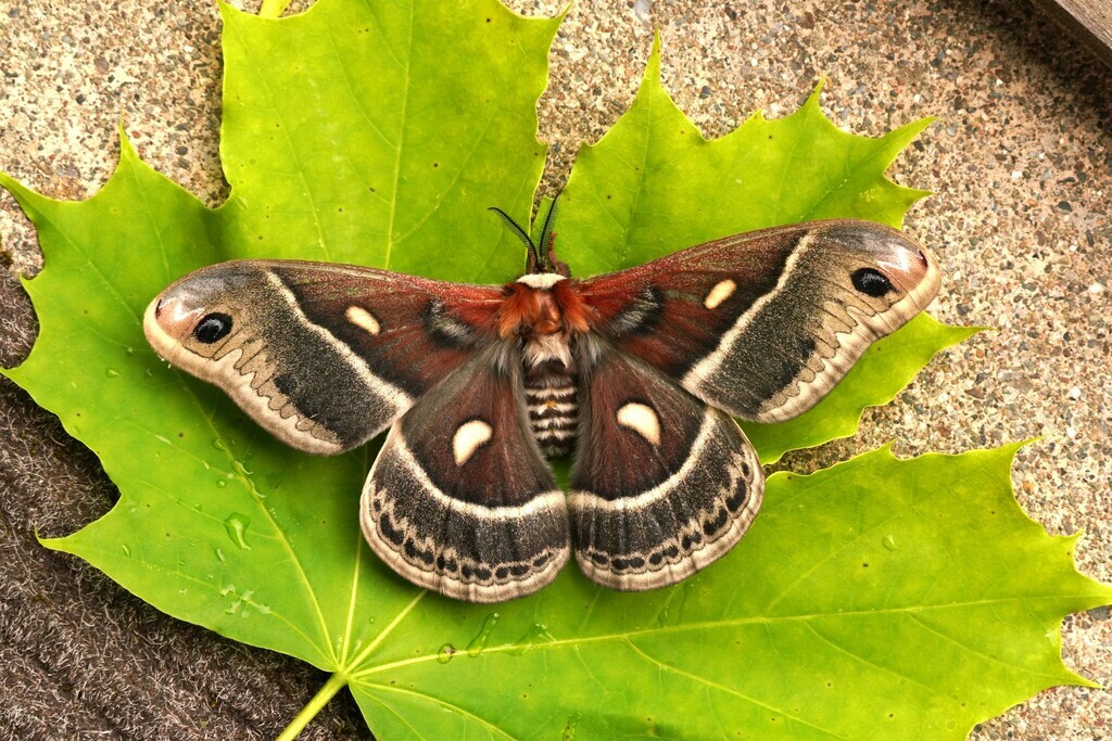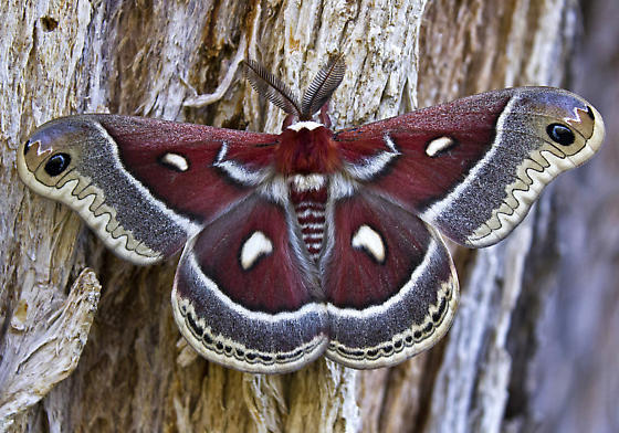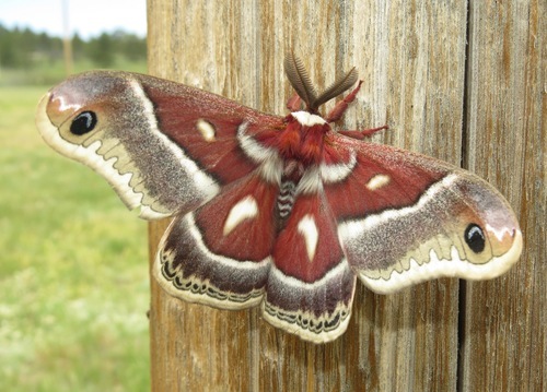 The Columbia Silkmoth is a large moth with mainly reddish brown wings and body. Female Columbia Silkmoths lay one or two eggs at the base of larch needles. Caterpillars appear in less than two weeks. The adults do not feed.
