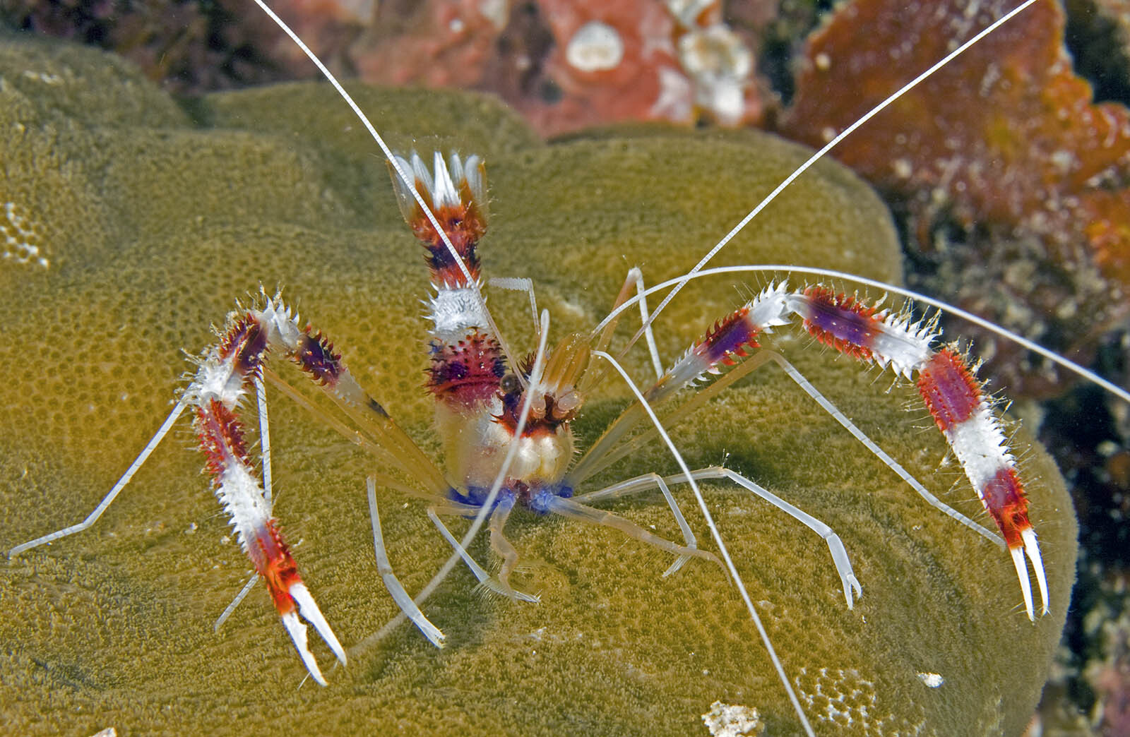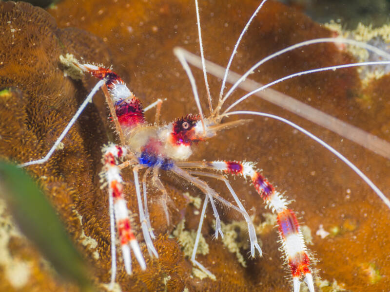 They are known for their vibrant red and white stripes as well as their bands on their pincer claws. Coral banded shrimp are characterized by very long white antennae and antennules, by bright red bars banding its white body, and by enlarged, chelated, third pereiopods.