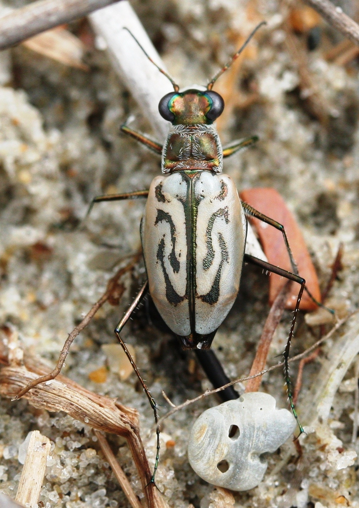 Cicindela dorsalis, commonly known as the Dunes Tiger Beetle, is a medium-sized, fast-moving beetle found along sandy coastal regions of North America. Its striking coloration and rapid hunting behavior make it a notable predator in its habitat.