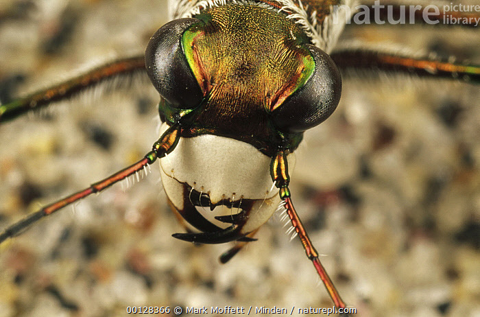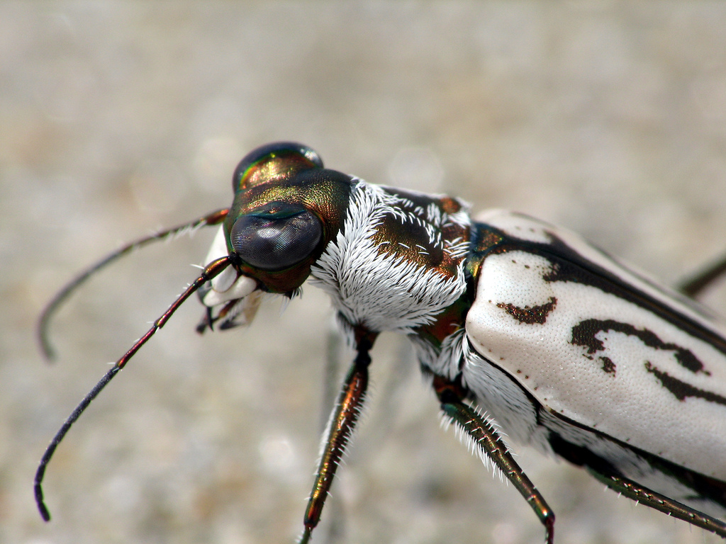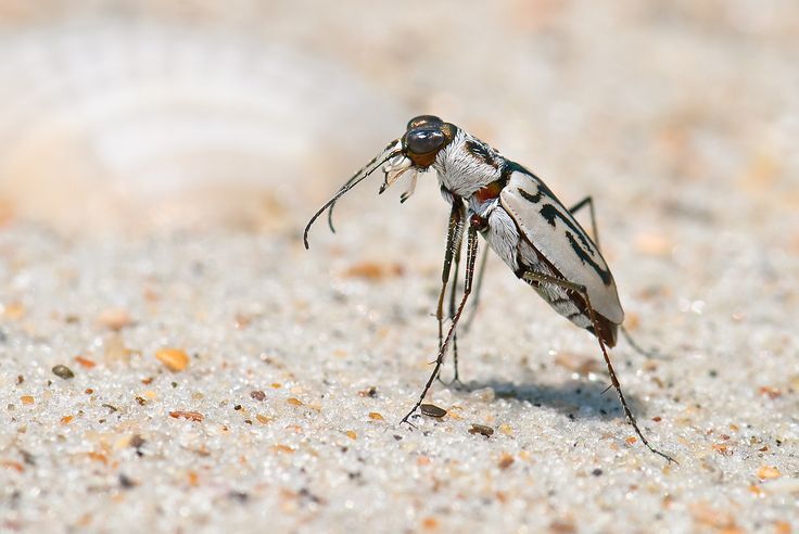 Its hardened forewings, also called elytra, acquire varying shades of white and tan. The northeastern beach tiger beetle has wings hidden under these elytra. The beetle has large white and black jaws, long antennae, and long legs that allow them to move quickly across hot sand. -