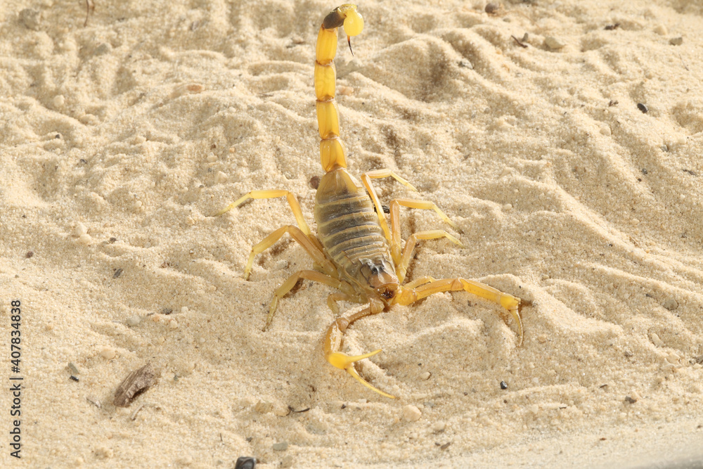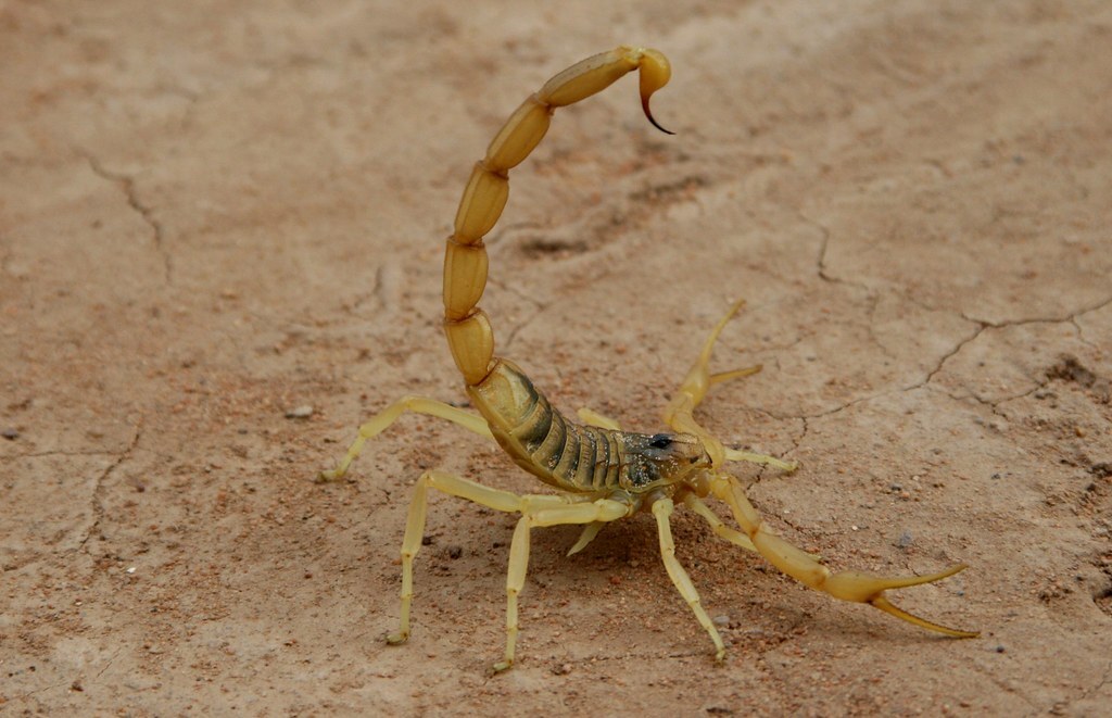 The deathstalker (Leiurus quinquestriatus) is a species of scorpion, a member of the family Buthidae. It is also known as the Palestine yellow scorpion, Omdurman scorpion, and Naqab desert scorpion. The deathstalker scorpion is primarily found in North Africa and the Middle East, but also occurs in Central Asia, India and Kazakhstan.