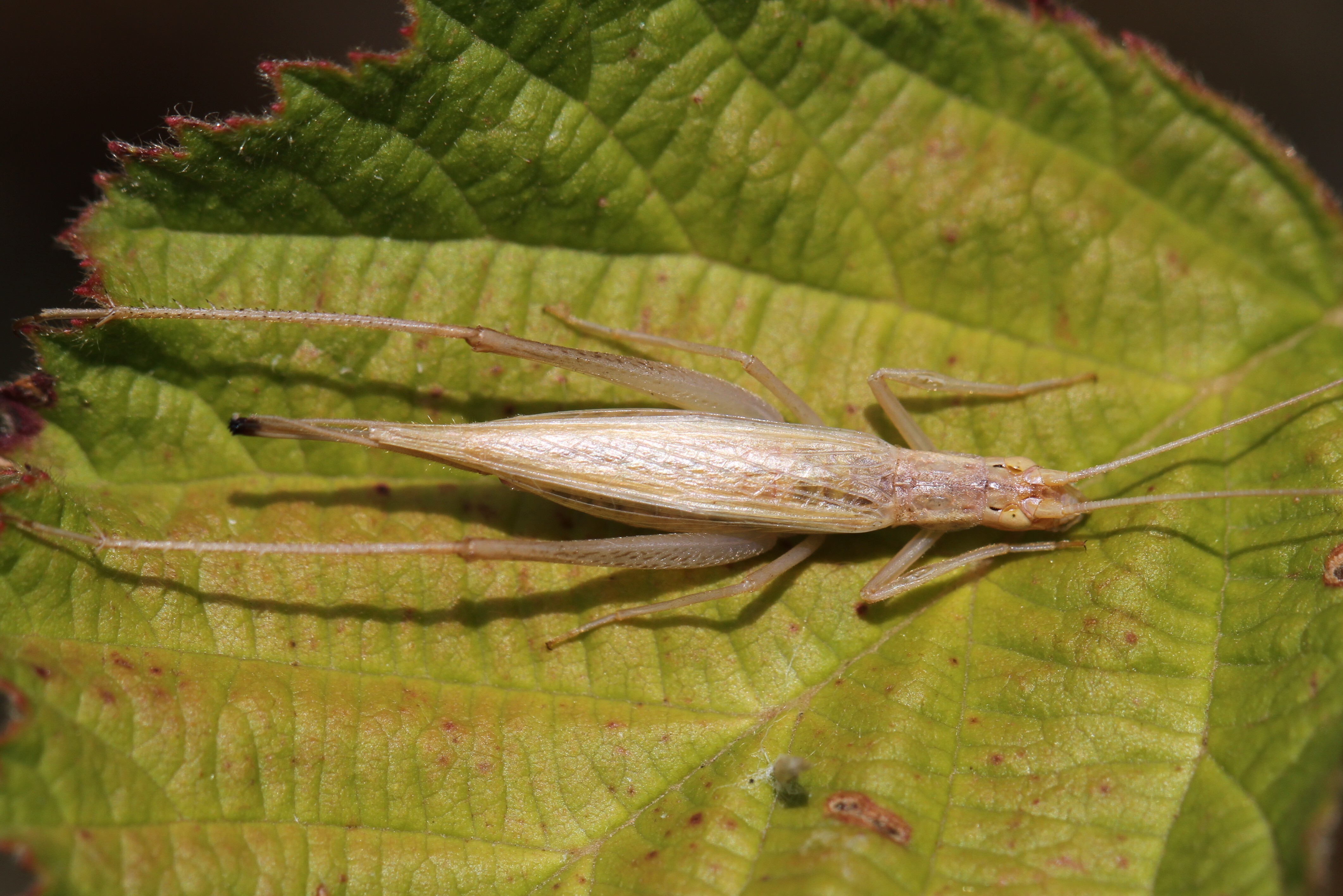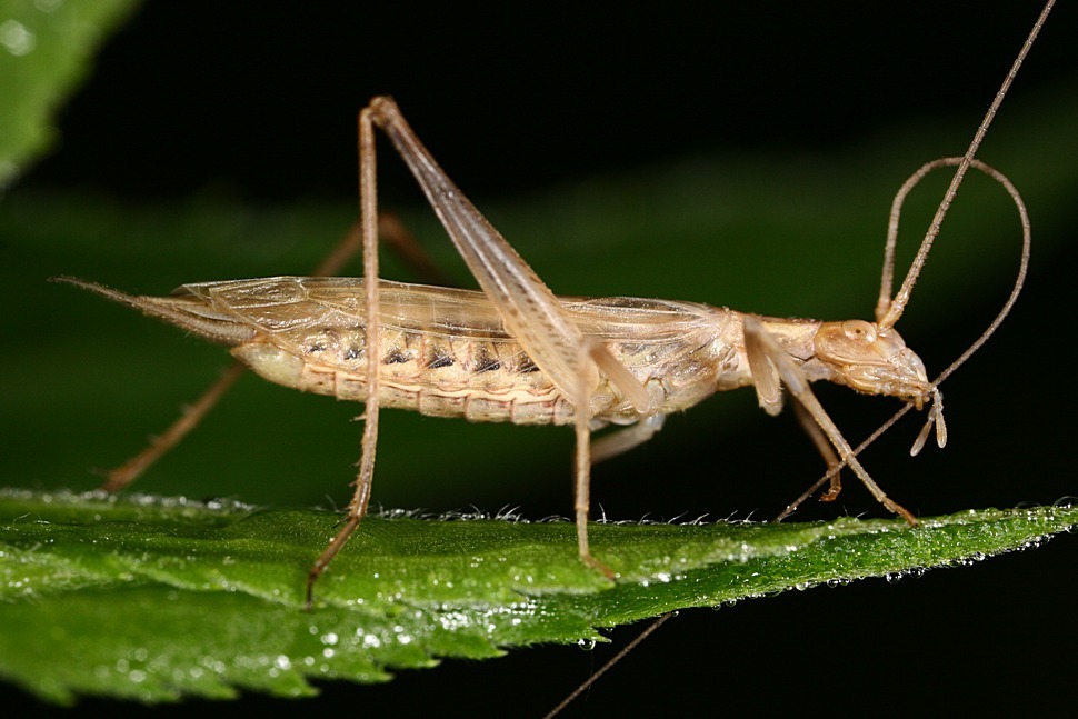 The most notable feature of Oecanthus pellucens is its long, clear wings that are held over the body when at rest. The transparency allows light to filter through, giving them a unique look. Adult individuals typically measure between 1 to 2 cm in body length. -