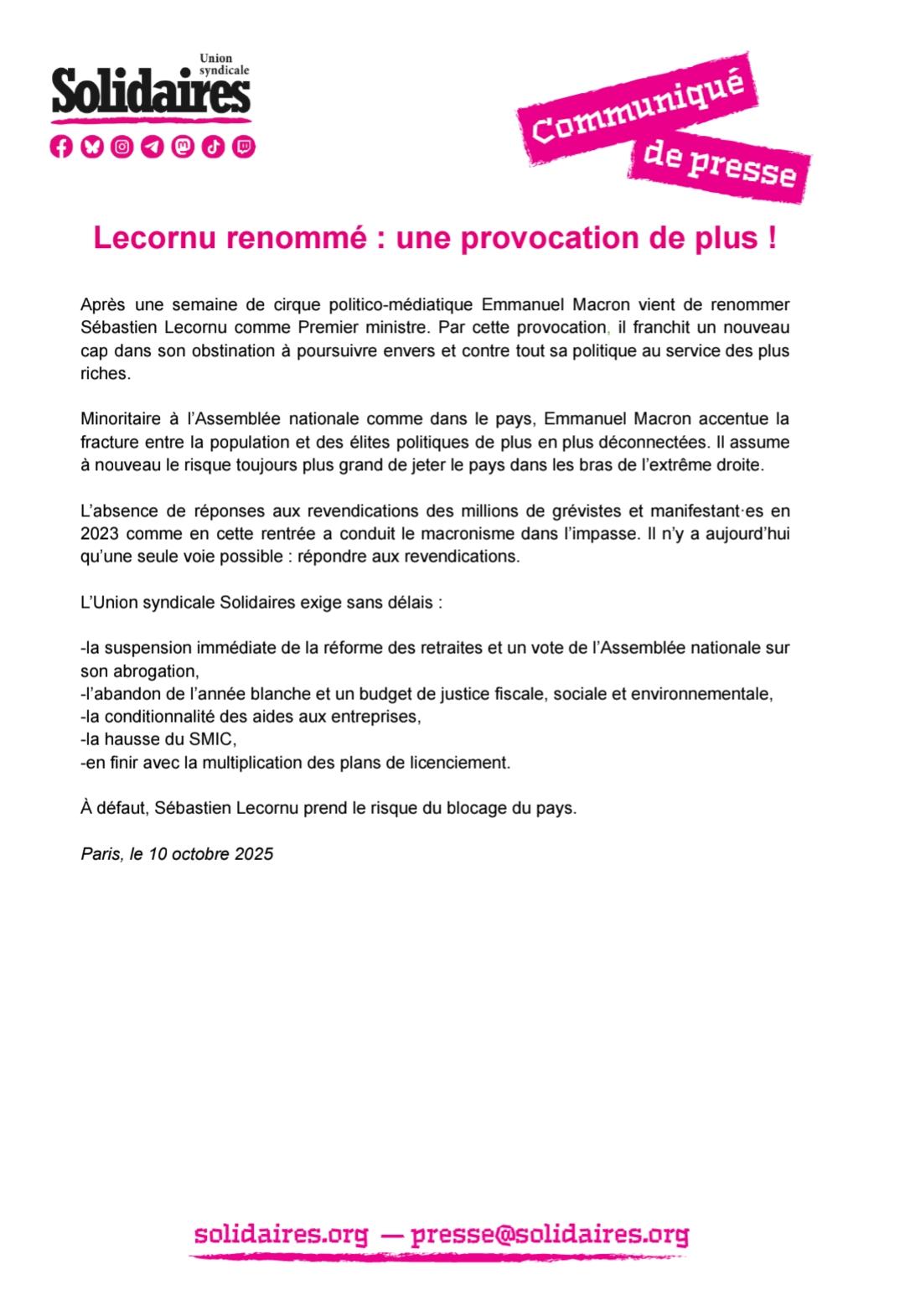 Lecornu renommé : une provocation de plus ! Macron s'entete dans sa politique au service des + riches. Il assume à nouveau le risque toujours plus grand de jeter le pays dans les bras de l’extrême droite. Solidaires exige l'abrogation de la réforme des retraites, l'abandon de l'année blanche, un budget justice sociale, fiscale et environnementale. Sans réponse, Lecornu prend le risque du blocage du pays!
