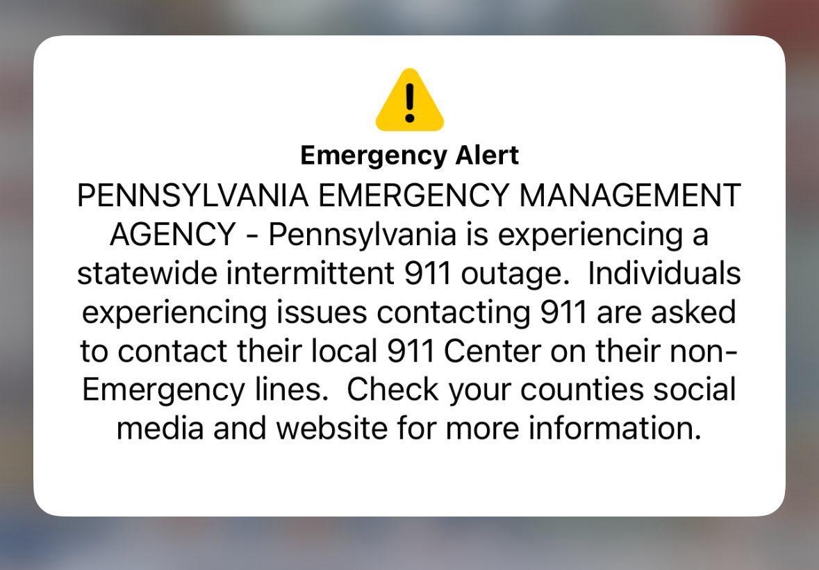 Uhhh so there's a 911 outage statewide in #PA? I'm having trouble finding info online about it, but Maggie & I got the alert pushed to our phones. I'm not sure what phone number you're supposed to use when 911 is down in #Philly, is it just 311?