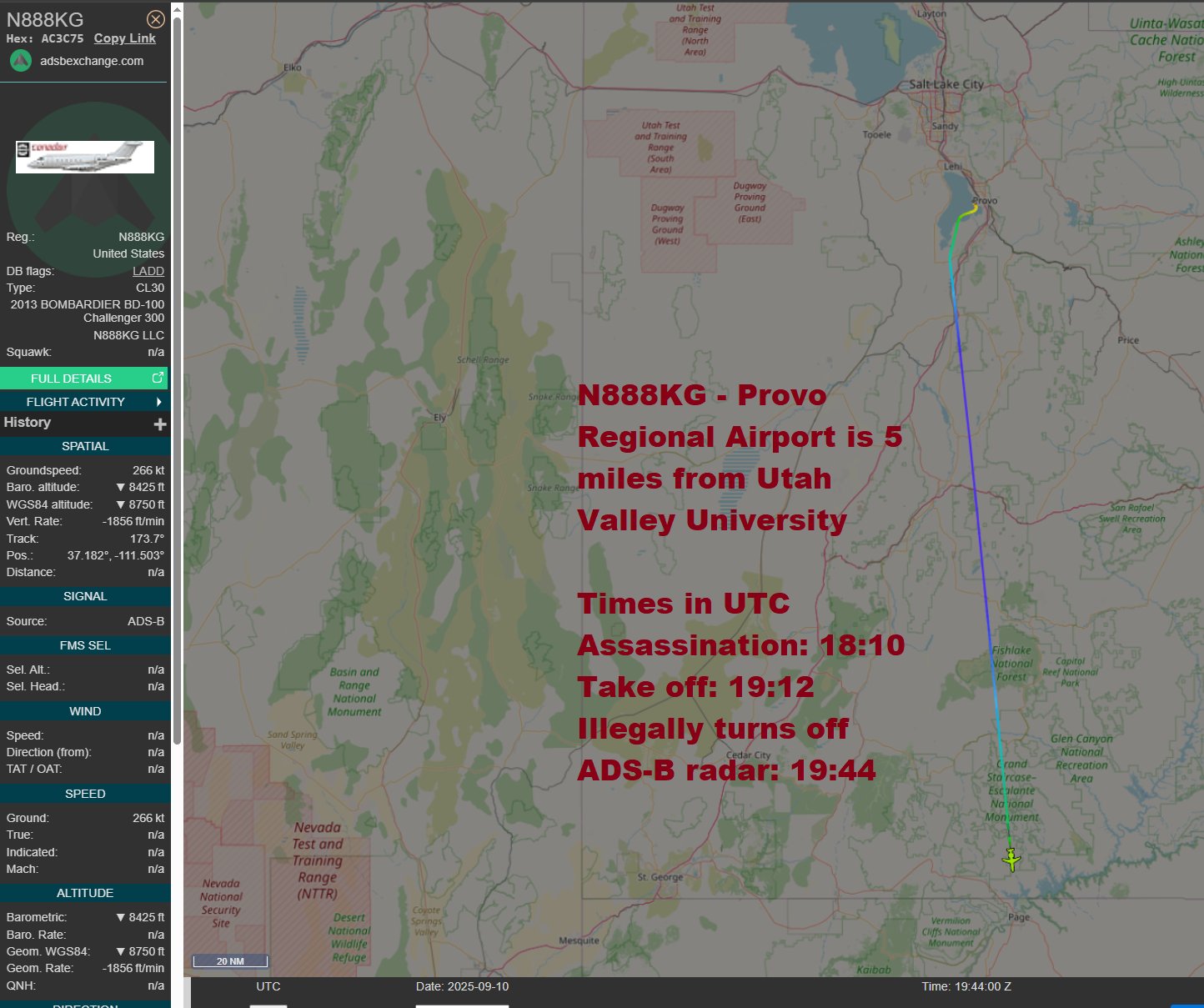 🚨 A private jet under the tail number N888KG left Provo airport an hour after the shooting