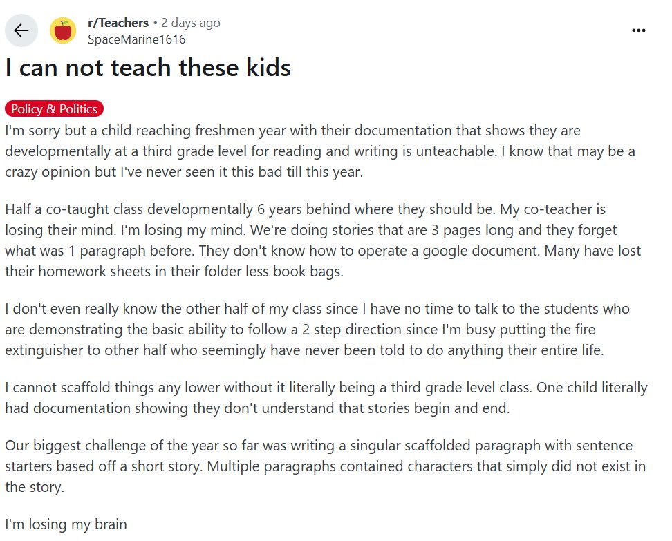 I always laugh so hard at these “the zoomers are retarded” teacher posts because as someone who knows a few teacher, these cases are always metro schools full of non-White kids.