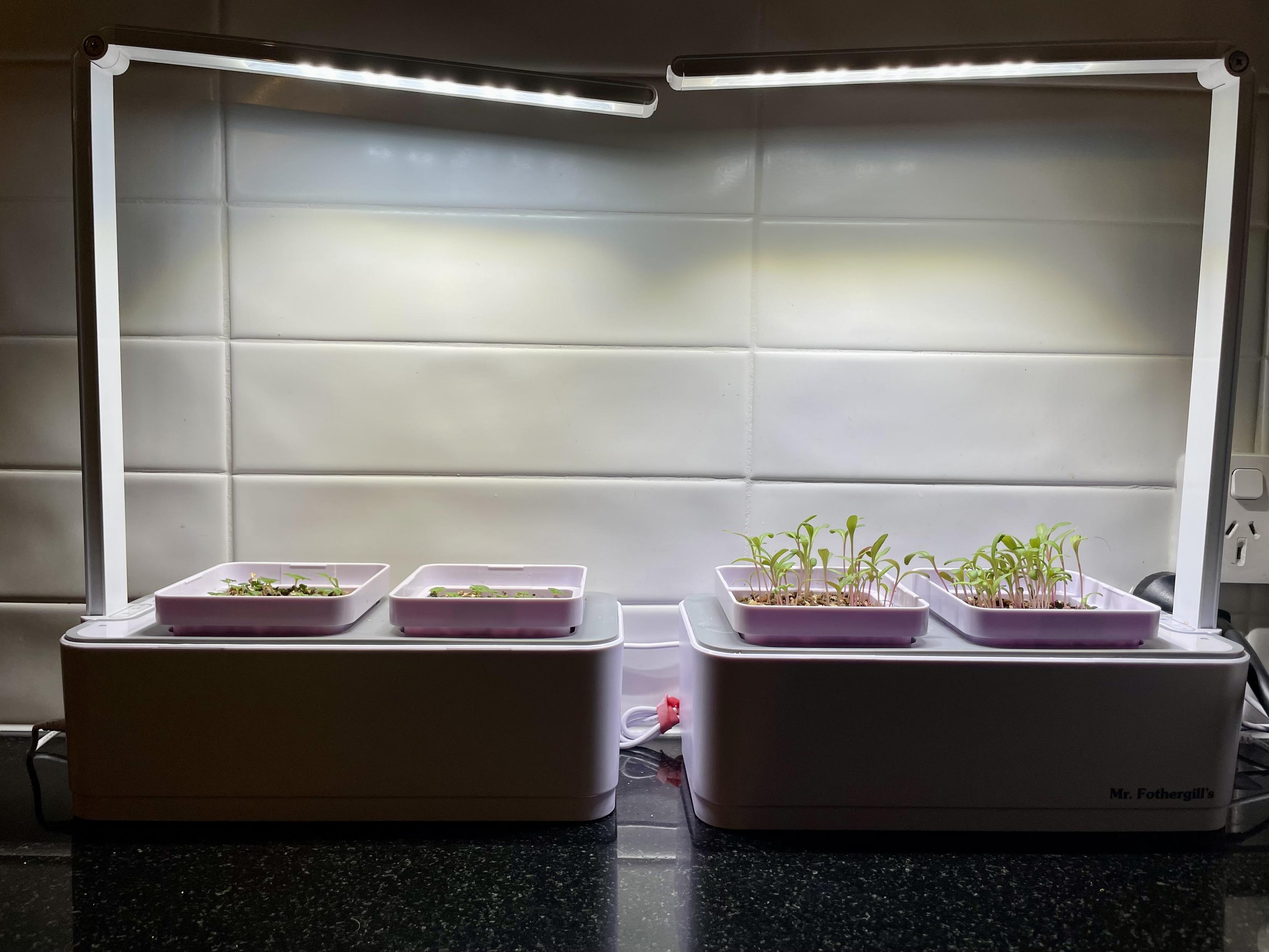 The silverbeet has overtaken the basil. I suspect the basil might have been stunted by a too-strong nutrient mix. I changed it out a few days ago and its recovering. L: basil (Week 4) R: silverbeet (Week 2) #hydroponics#SolarPunkSunday