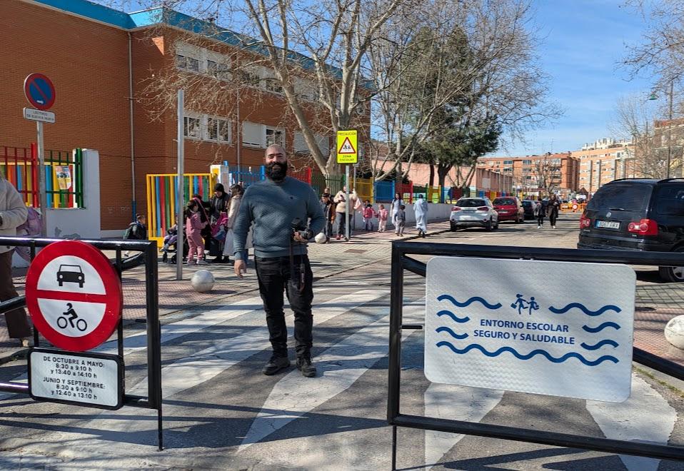 El señor de en medio de la foto soy yo. Y si se hace zoom sobre mi cara se puede constatar que soy la persona más feliz del mundo al presenciar el despliegue de una de las políticas más bonitas en materia de movilidad, seguridad y autonomía peatonal infantil: el primer Entorno Escolar Seguro y Saludable del municipio de Parla.