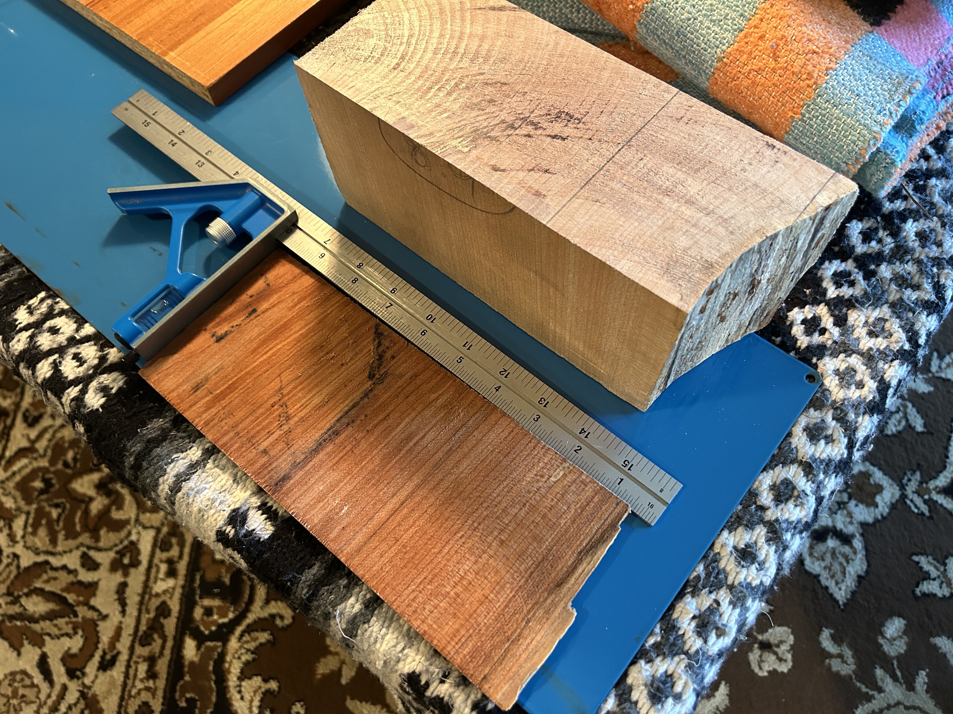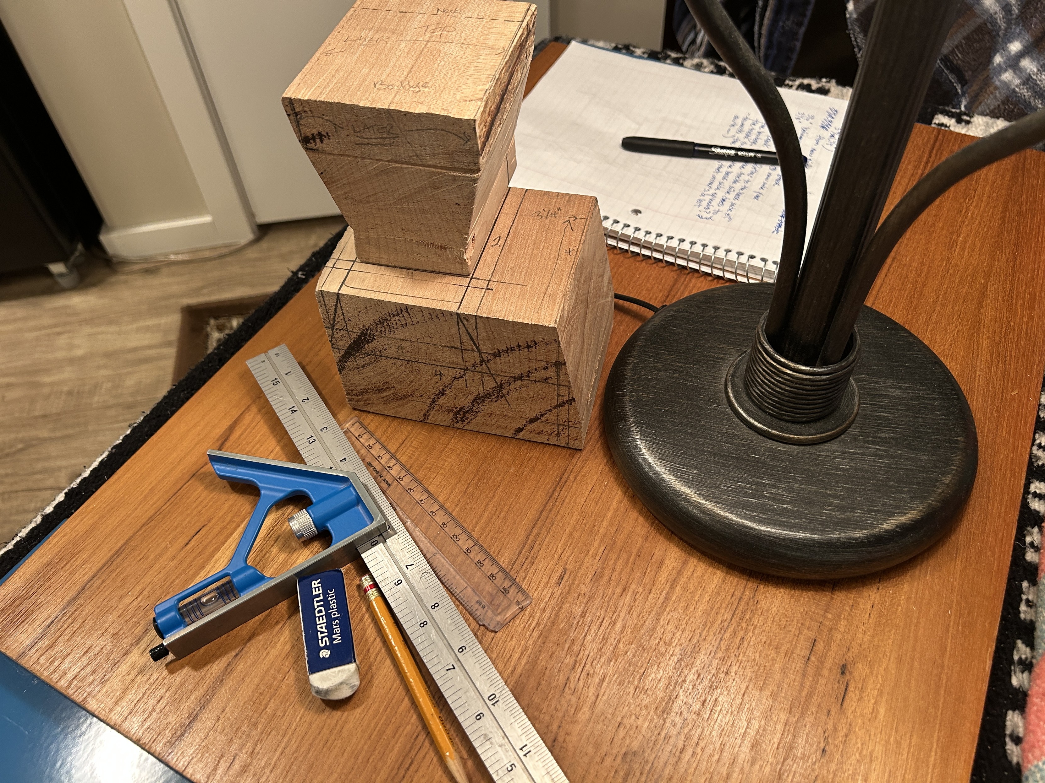 it will be a block in three pieces, instead of two, a bespoke piece fitted in the bottom, or back (already begun), and another at the top, both cut diagonally, so I can marry it all with a wedge in the middle, then drill and dowel them together from the top, I mean the front, in the hole where the neck will go. Yes?
