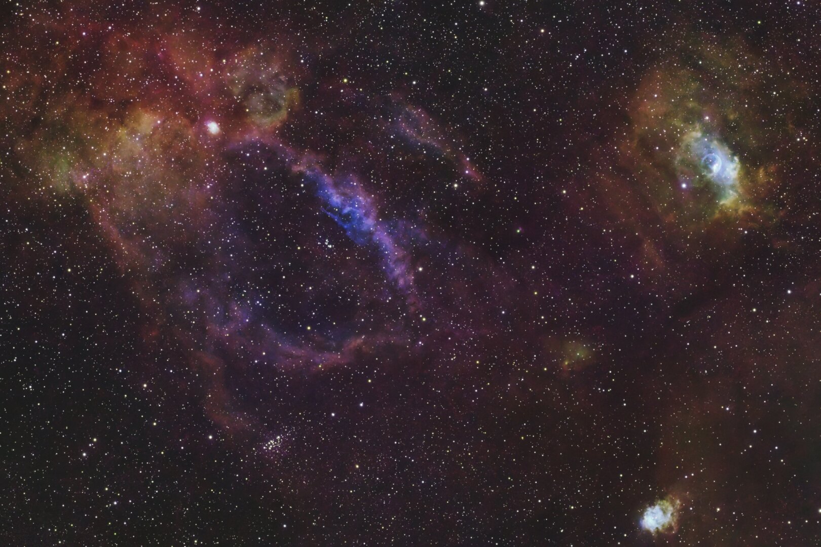 Behold, the Lobster Claw Nebula (SH 1-109, left), the Bubble Nebula (NGC 7635, right), and NGC 7538 (bottom)