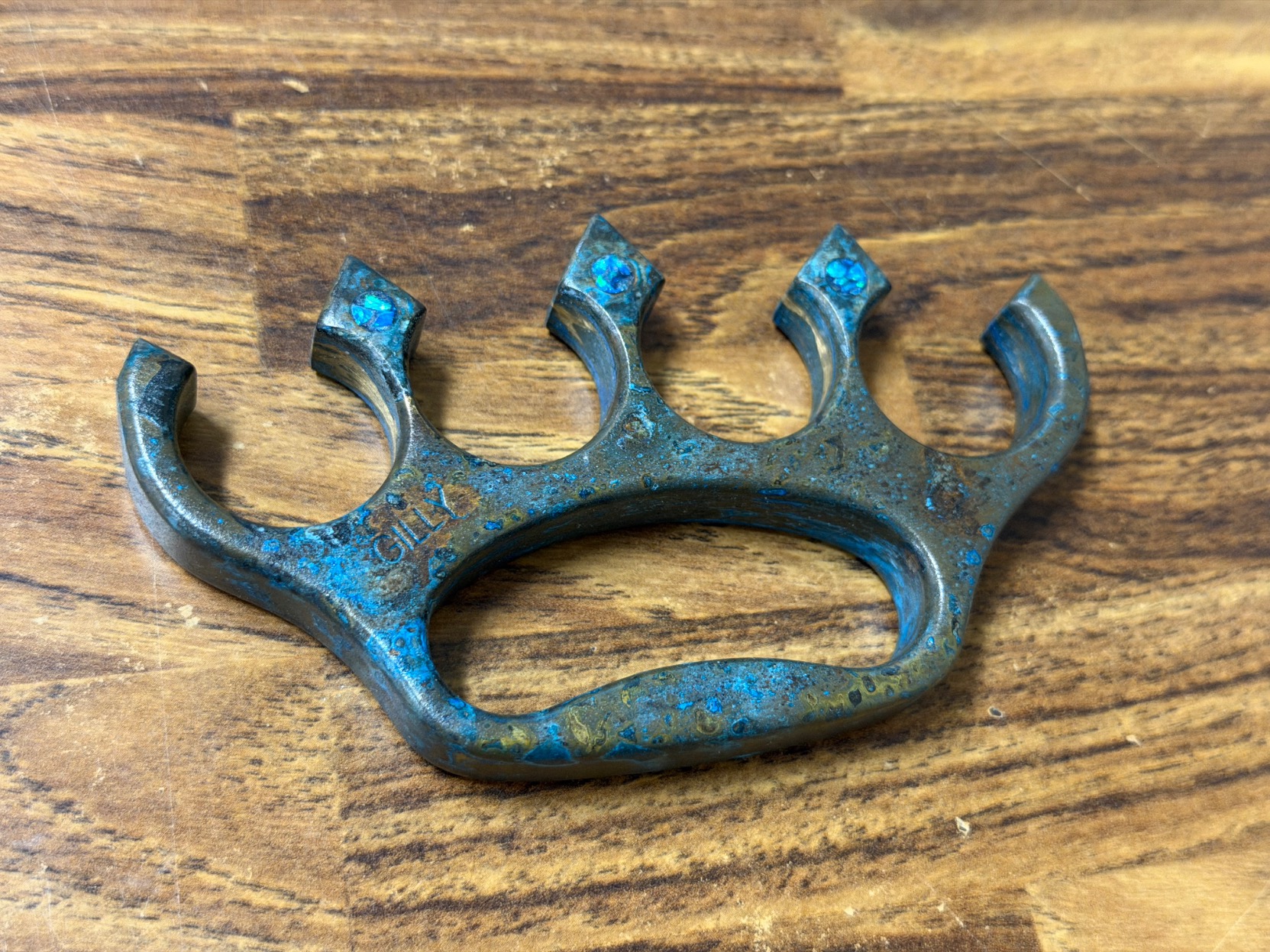 latest addition to my knuckle duster carry rotation. made of brass with a “ship wrecked” patina (a type of finish caused by salt & ammonia) and 6 crushed opal inlays, 3 on each side. -