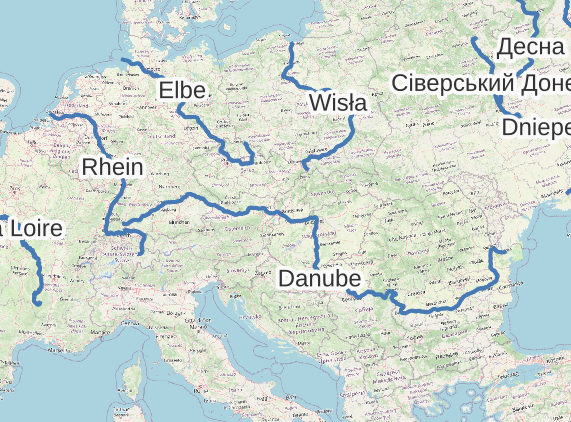Notice how the Rhein, Elbe & Danube are all connected up as a single feature with the same name? It's using the `name` tag from the relation to match them up.