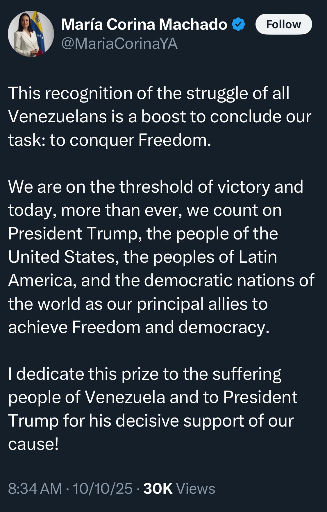 @WarnerCrocker Machado issues her first statement since being awarded the Nobel Peace Prize and dedicated her prize to Trump!!!. What a BS NobelPrice - sorry to burst the bubble.