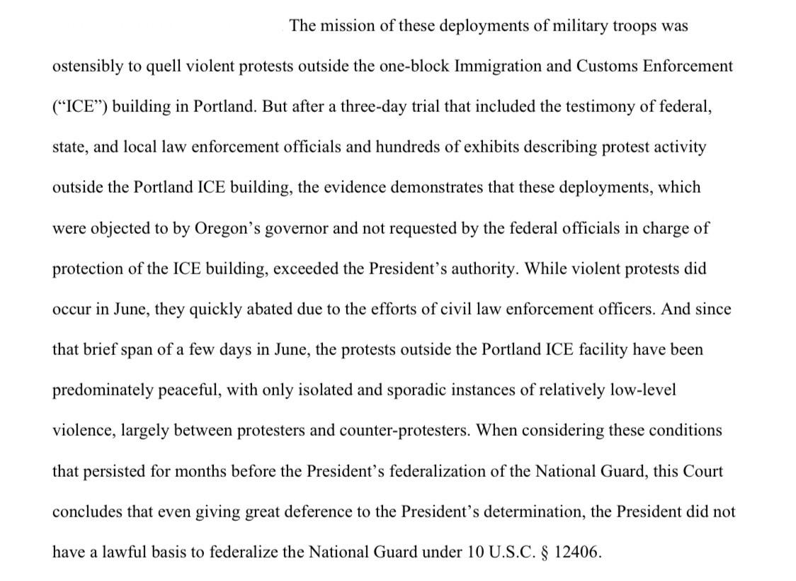 District Judge Immergut rules that Trump's deployment of the national guard in Portland, Oregon, was illegal, and immediately ends the deployment.