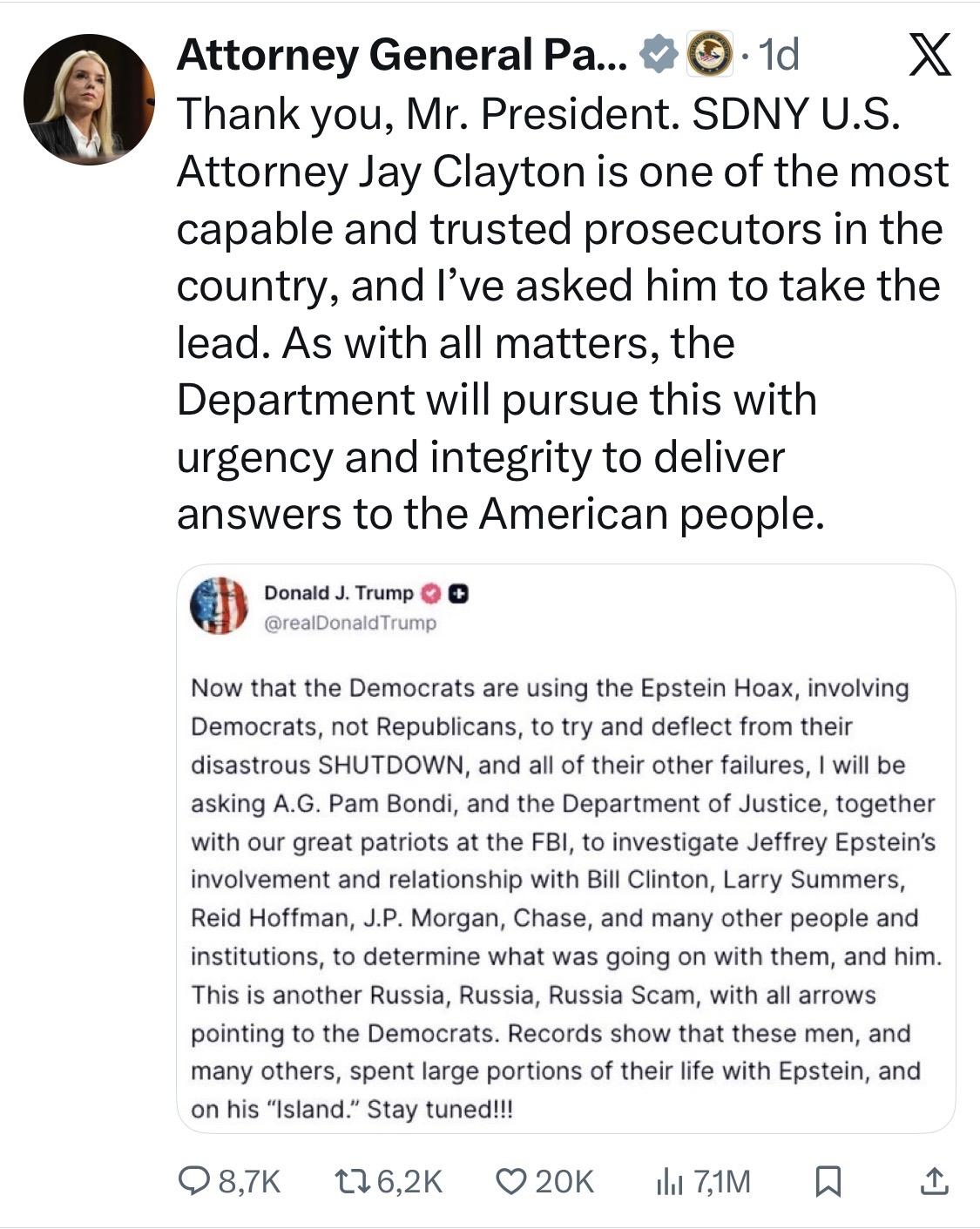 How convenient — now Trump can say they are investigating the Epstein files, and then slow walk that investigation forever while ensuring Trump is not investigated. All the while any request for public oversight can be denied on the grounds of there being an ongoing investigation.