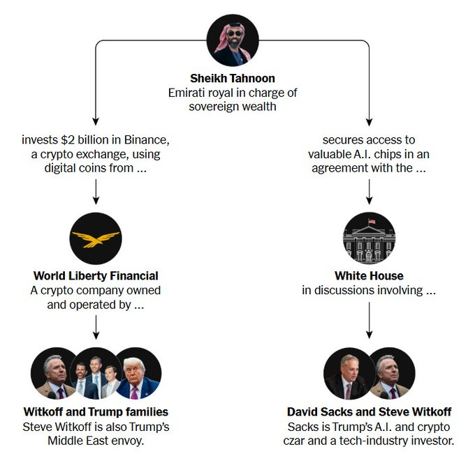 NYT dropped a bomb: #Trump’s ally Steve Witkoff negotiated w/ a UAE sheikh for massive Nvidia chip supplies. At the same time, the SAME sheikh “invested” $2B in World Liberty Financial — a shady crypto firm tied to Witkoff + Trump families. Looks like a straight bribe, laundered via coins. We joked Trump’s scams were pay-to-play… turns out it’s happening openly, right in front of us.