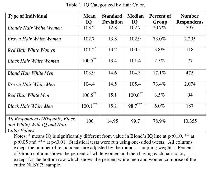 @f0x @Frank @bajax @dcc @pwm It says blondes and brown haired (both men and women) have no statistically significant difference, but have significantly higher IQs than naturally red and black haired people (so Irish, Greeks, etc). But even if they were all the same, the main point that blondes aren't retarded still stands.