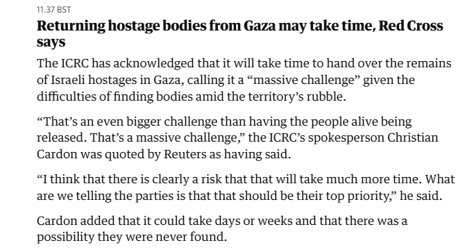 Seems like the Paedophile's Peace Plan was set up to fail, Israel is demanding the impossible with these bodies and it fully intends to renege on the agreement because of it.