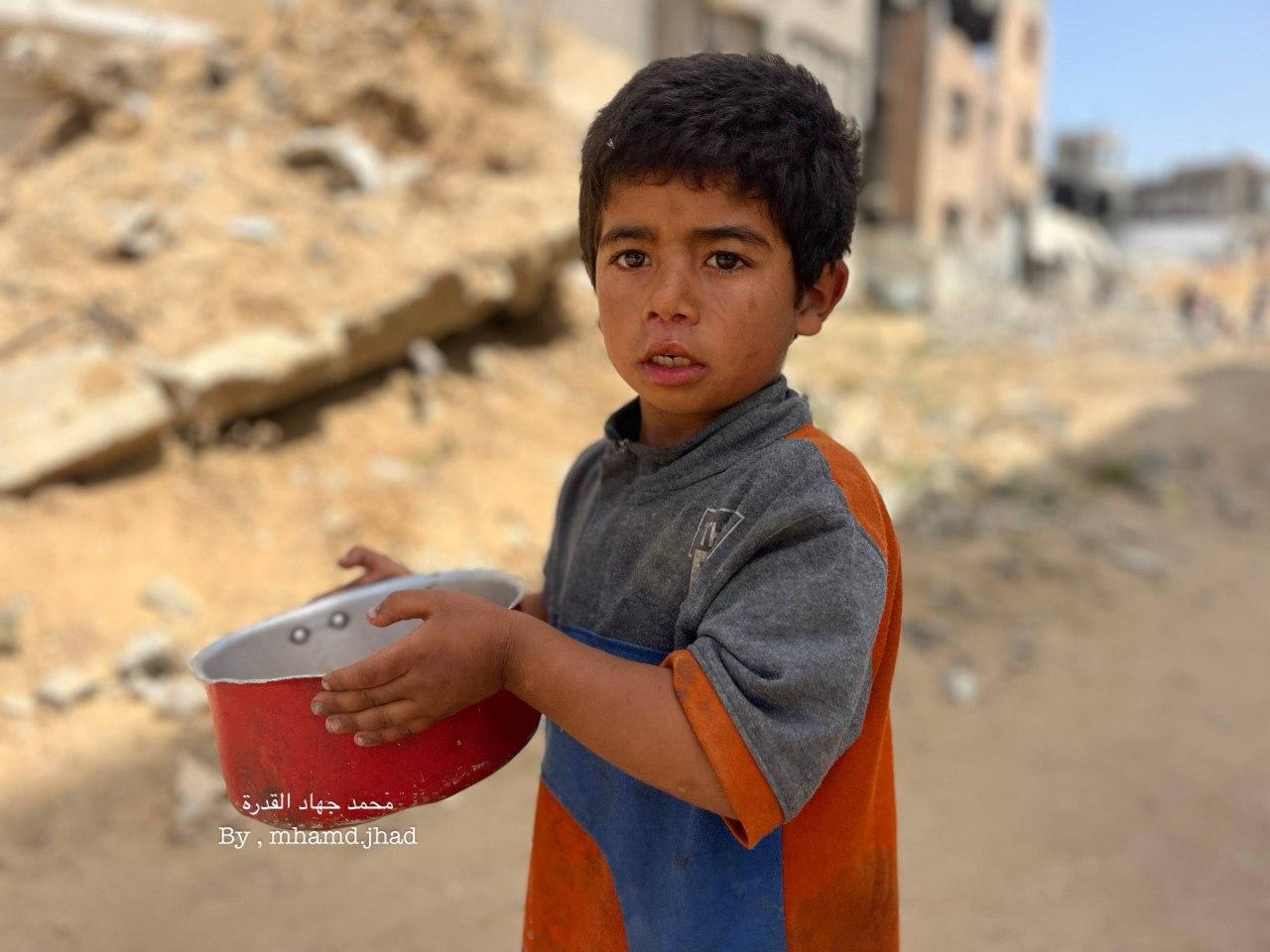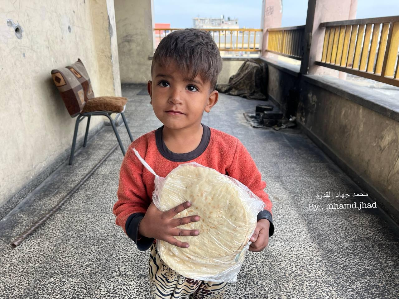 These are pics of kids: the first a kid carrying a bundle of bread, and the second holding a pot with a little soup. I personally took these photos with my camera while working on a news report for an organization. I stress this point cos some friends here were upset before when I used pictures taken by colleagues who had documented scenes of displacement from northern #gaza arriving at the position before me. These two children are the ones responsible for finding food for their family @aral